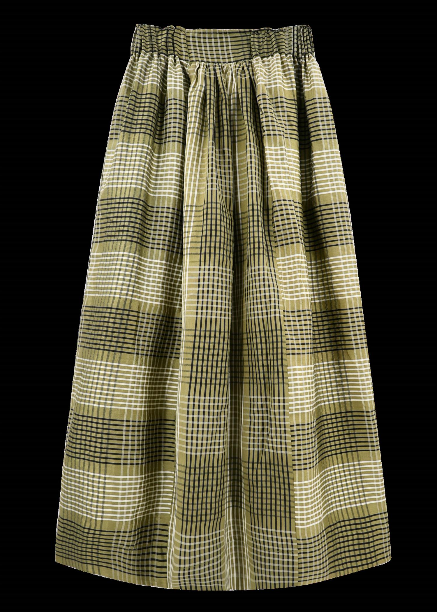 Tuck in your favorite tee for a more casual yet feminine look. The Verona Skirt by Mirth in olive plaid is an elegant choice crafted from a silk blend with a garment length of 35.25 inches. Featuring a pull-on closure, this maxi skirt is fully lined with soft cotton for added comfort and comes with practical side pockets. Made in India, this piece effortlessly combines style and utility. Care instructions recommend dry cleaning to maintain its luxurious appearance.