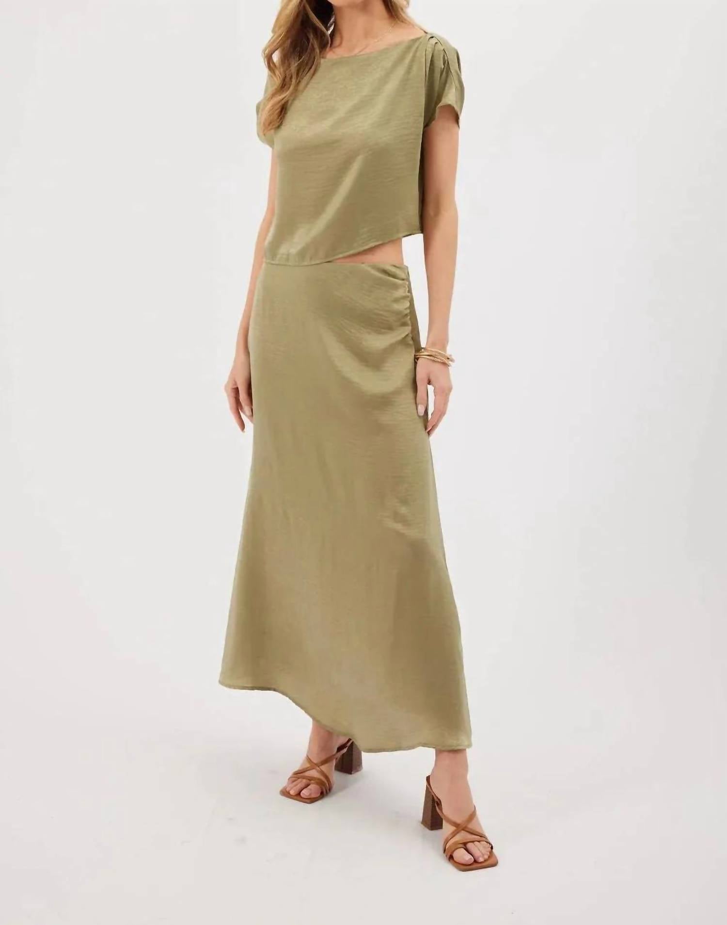 Tuck your favorite tee into this midi length skirt for an effortlessly cool look. The Jana Midi Skirt by Kylie Paige in sage offers a perfect blend of comfort and style with its sleek side zipper for easy wear and shirring detail for added texture. Crafted from 100% Polyester, this versatile skirt features a midi length with a 35" inseam, making it suitable for both day and night occasions. Care instructions advise hand washing in cold water and air drying. Ideal for pairing with a blouse for the office or a cropped sweater for outings, it ensures a polished look every time. Model is 5'9" and is wearing a size Small.