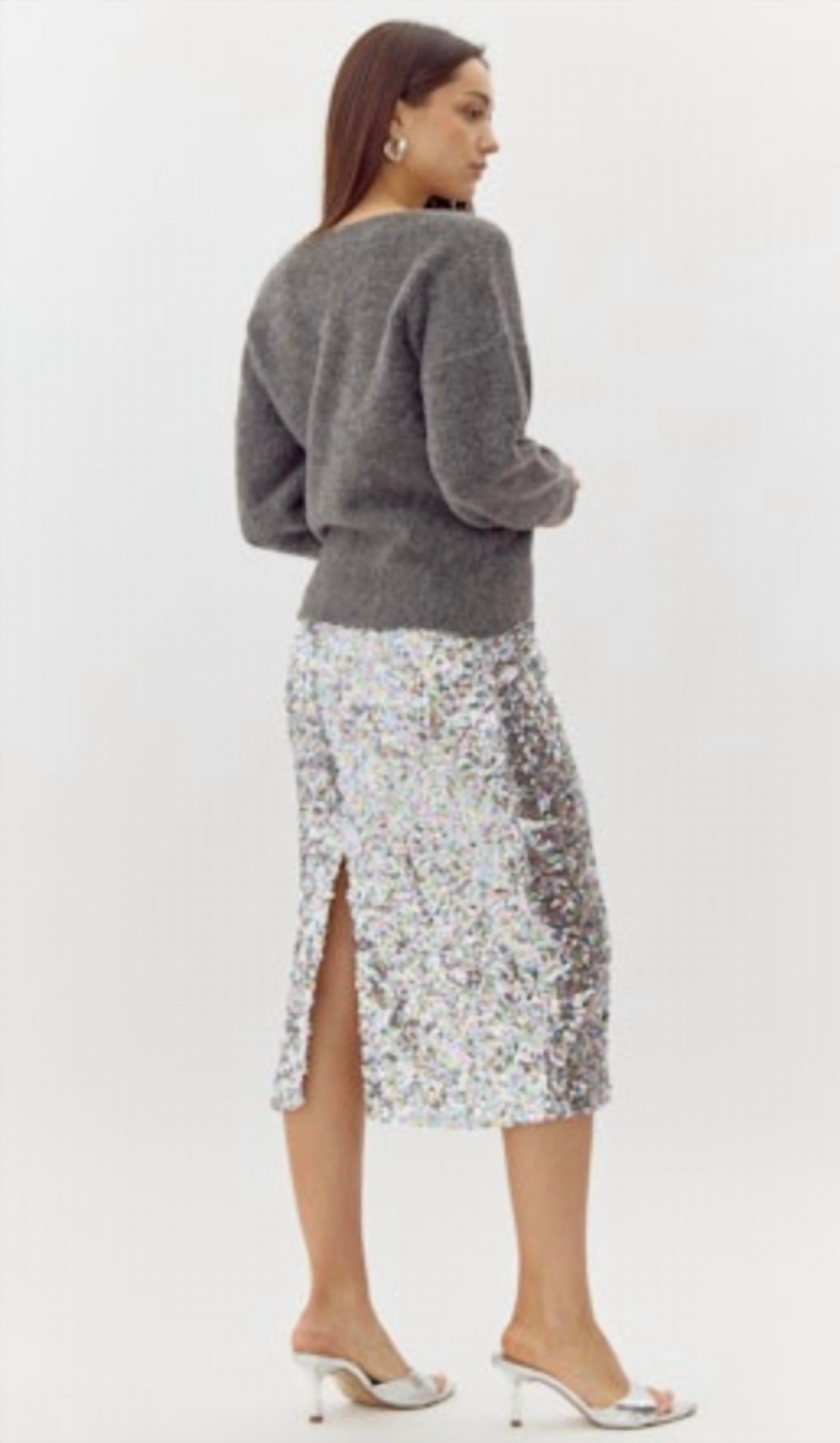 Show off just the right amount of skin in this beautifuly designed midi length skirt. Introducing the GREYLIN Lacey Sequins Midi Skirt, a dazzling addition to any wardrobe with its silver multi-color palette. This women's midi-length skirt crafted from polyester is embellished with multicolored sequins, offering a textured pattern that's truly eye-catching. Designed with a high back slit, it delivers both style and ease of movement. Care instructions include hand washing and laying flat to dry.