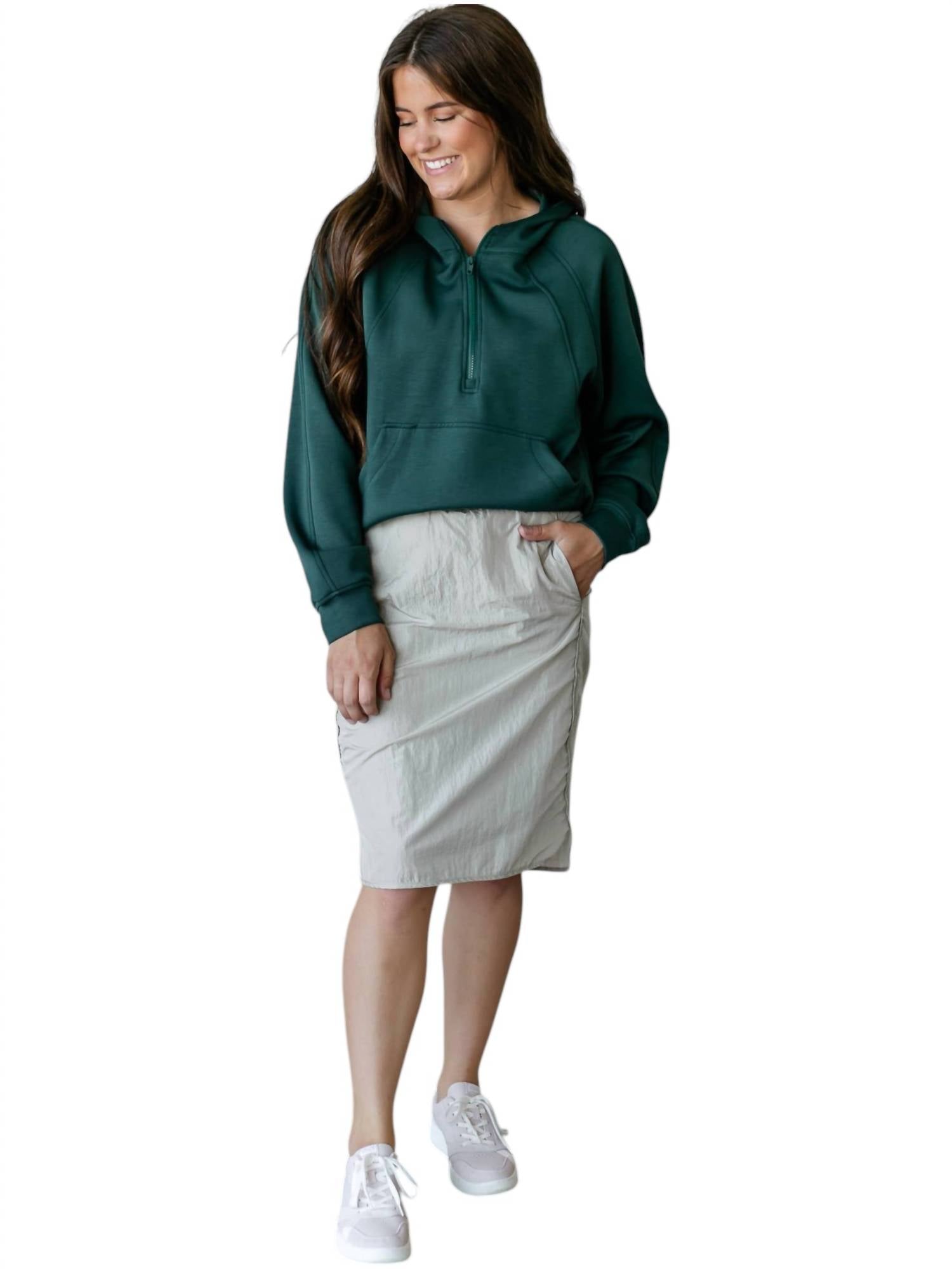 The midi length skirt is here to stay and we especially love this style. Introducing the Wind Breaker High Rise Midi Skirt by Inherit Clothing Company, a stylish and modest piece designed for active adventures. Made from 100% nylon, this solid-color midi skirt comes in taupe and offers a high-rise silhouette with a wide smocked waistband for a flattering fit. Its split hem provides flexibility, and it includes built-in knee-length biker shorts for added coverage. Care instructions should be followed as indicated on the garment label.