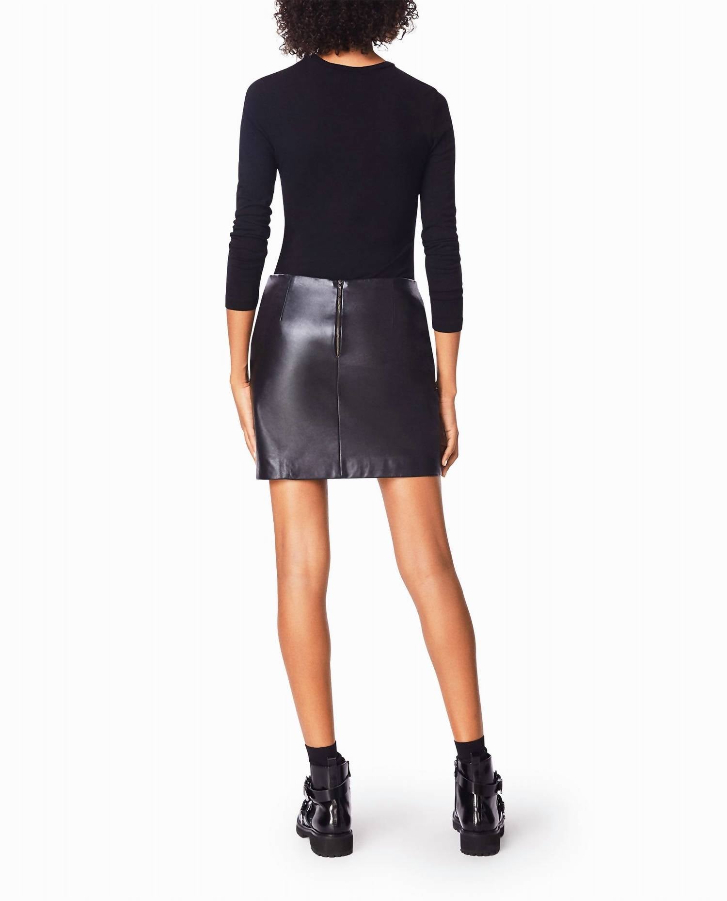 This Skirt is a chic mini crafted from 100% sheep leather, adorned with sparkling silver and gold stars. Featuring a sleek, exposed back zipper closure and a length of 15.5 inches from the front top edge to hem, it ensures a secure and flattering fit. Professional leather clean only.