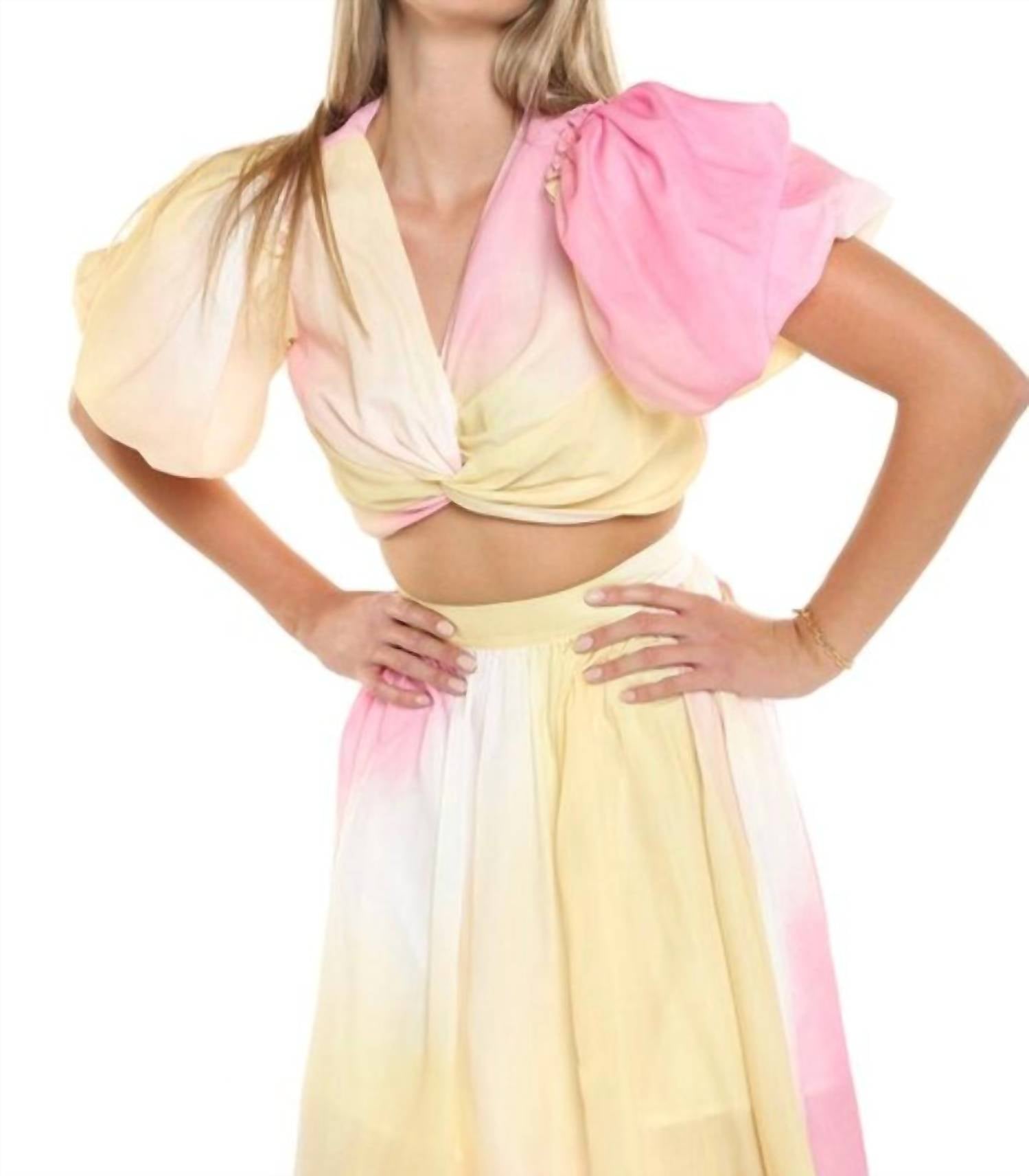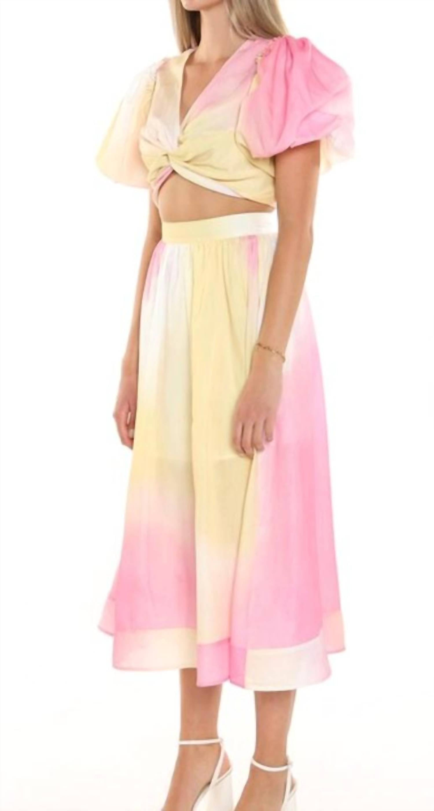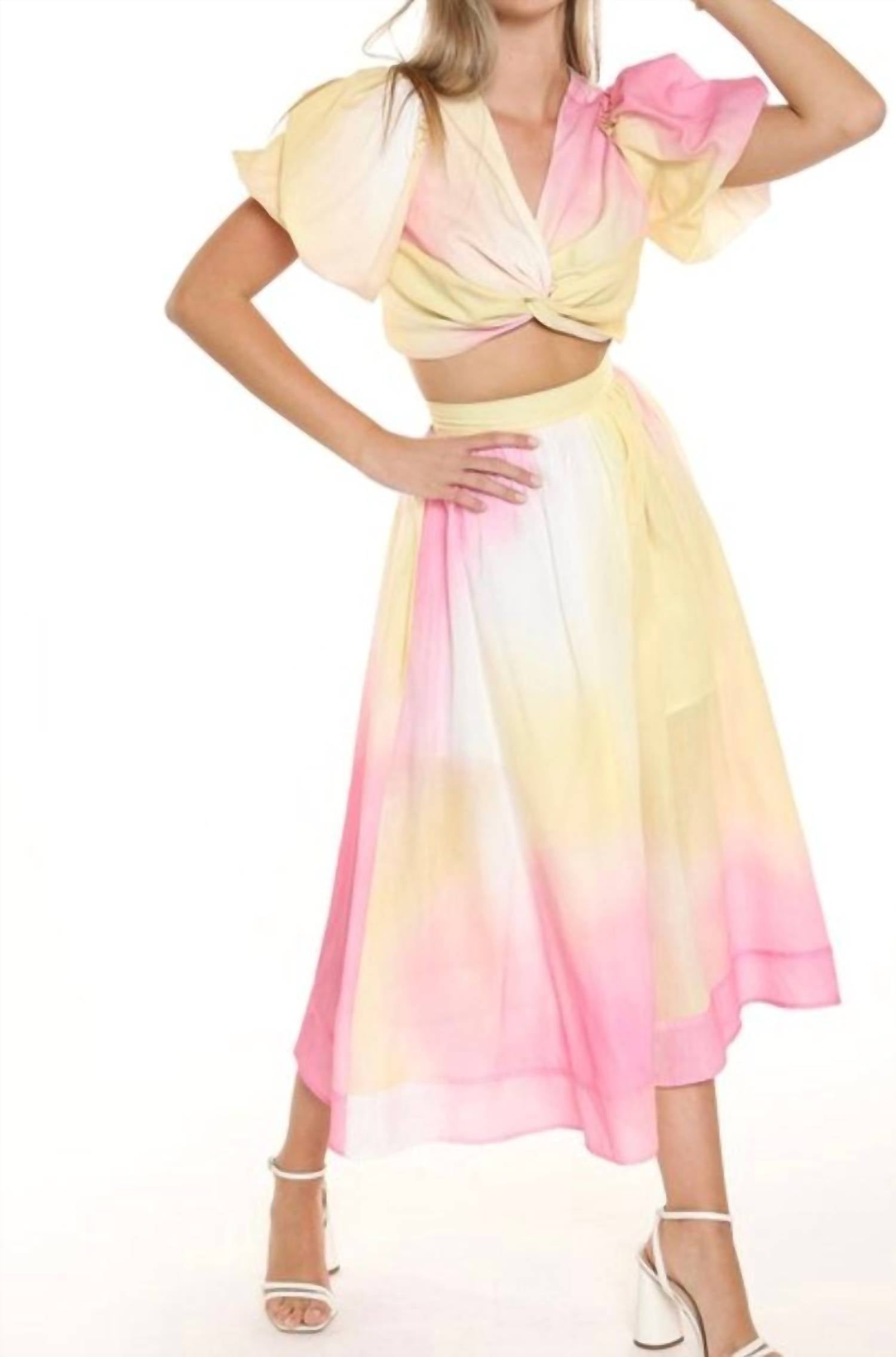 Embrace sophisticated style with the Cloud Burst Puff Sleeve Set by BEULAHSTYLE, an enchanting addition in tie-dye pink. Crafted from a linen blend, this set features charming puff sleeves and a twist feature at the center front, adding unique details to your wardrobe. It sports a metal zipper down the back with a zip flap and raw edges throughout, bringing an edgy finish. This skirt set does not include pockets.