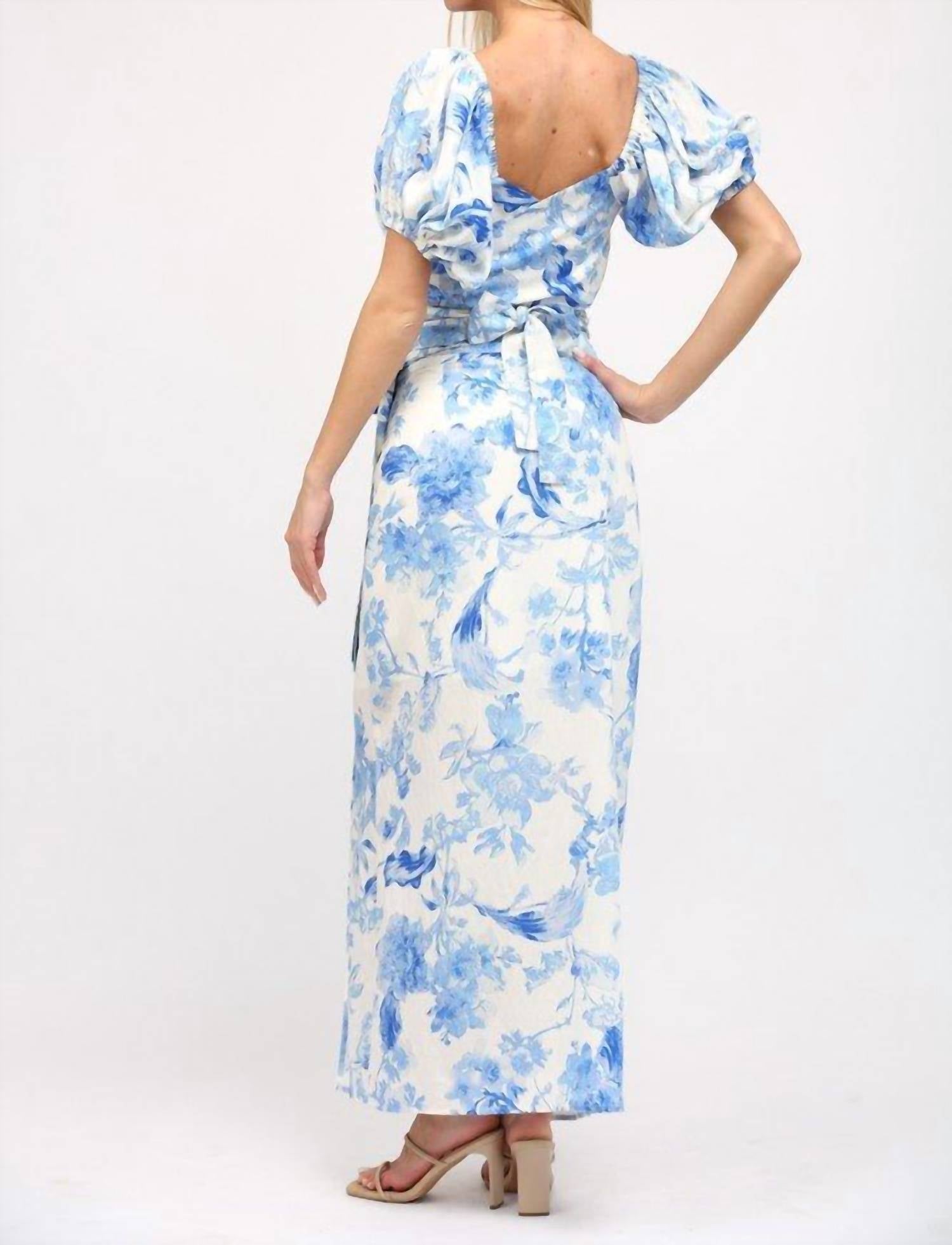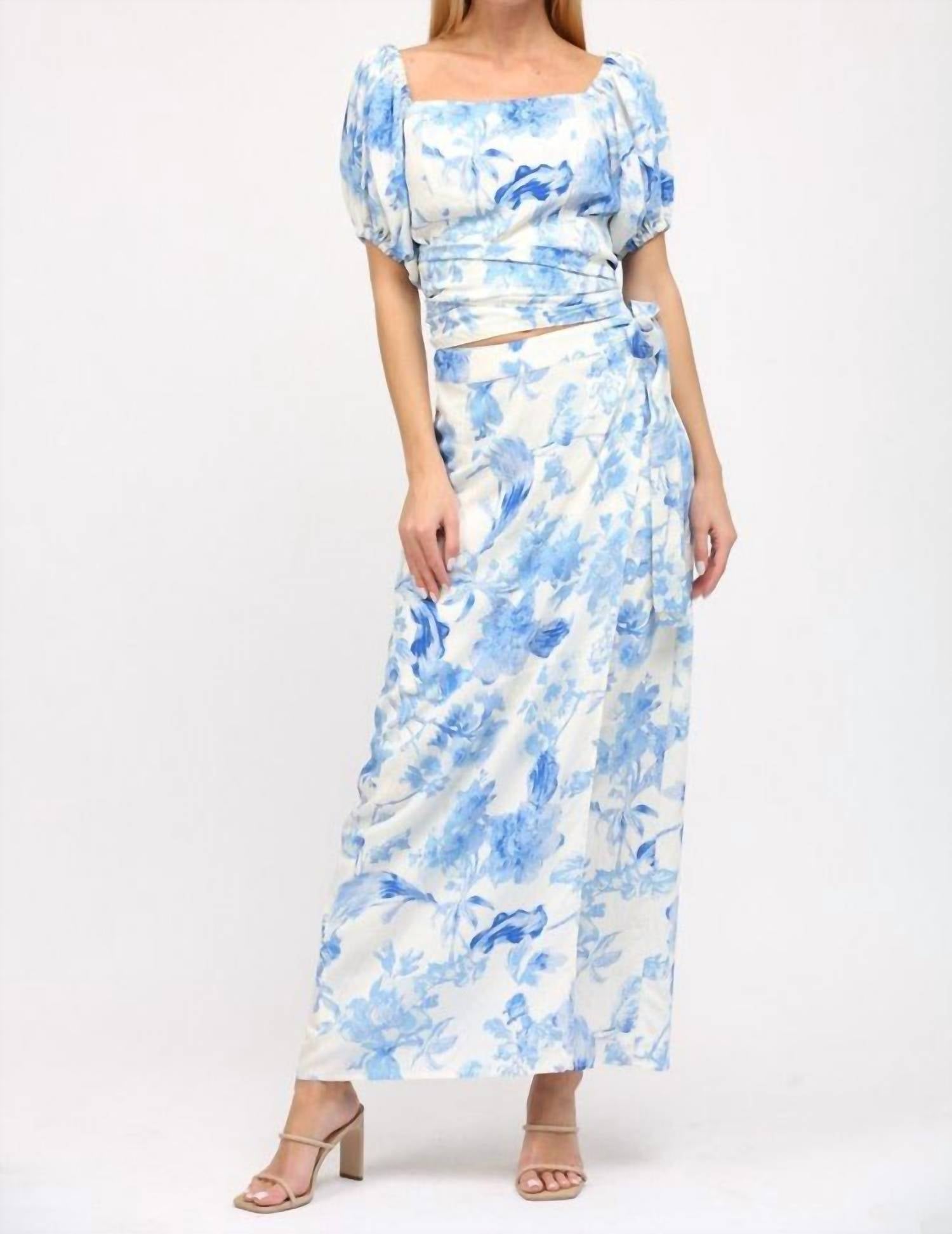 Add a touch of elegance to your wardrobe with the Flora Wrap Skirt by Fate, designed in a delightful blue and cream floral pattern. This maxi skirt is crafted from a durable and comfortable blend of 83% rayon and 17% nylon, perfect for any occasion. Featuring a convenient tie closure, this skirt effortlessly combines style with practicality. Please note that specific care instructions are not provided.