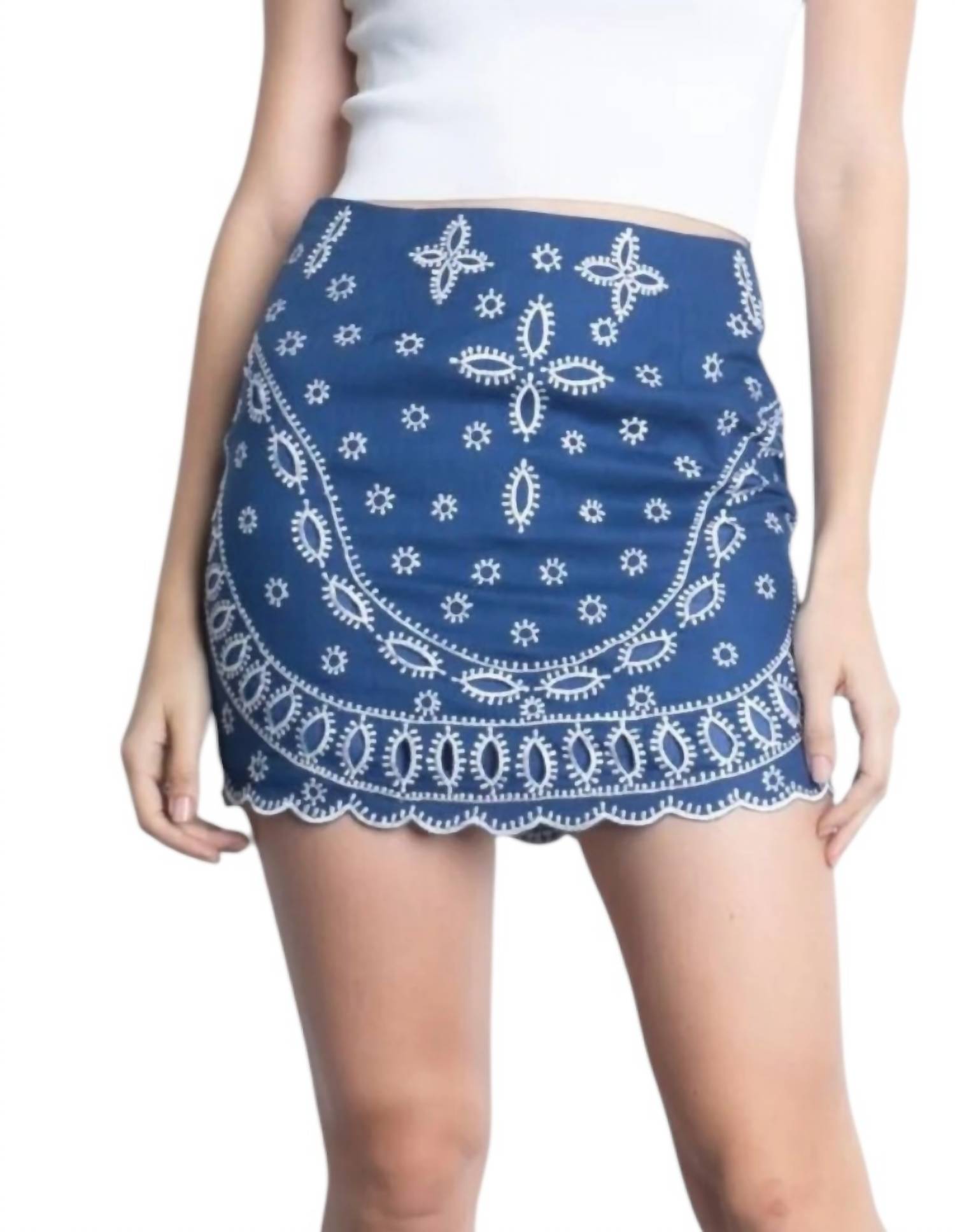 Show just the right amount of leg in this fit flattering mini. Introducing the Illiana Embroidered Linen Skirt by Karina Grimaldi, a chic mini skirt in a denim hue designed for stylish comfort. Made from 100% linen with a cotton lining, this skirt features bandana-inspired white embroidery, adding a touch of elegance. It comes with a convenient side zip closure. Ideal for pairing with various white tops, making it a versatile addition to your wardrobe.