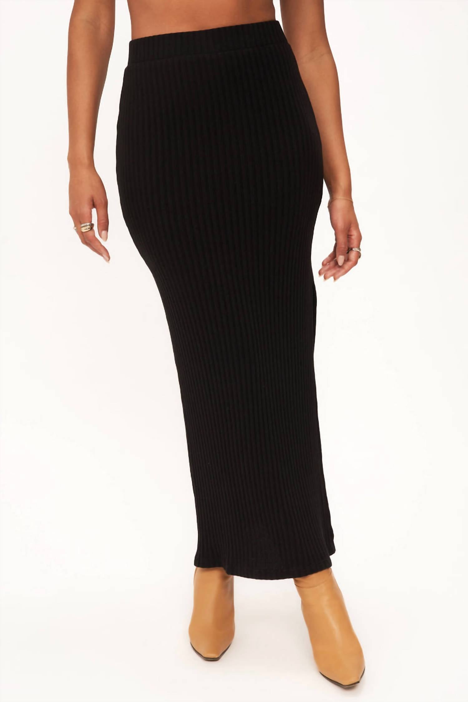 Flowy, comortable and stylish. This maxi skirt is a fan favorite. High-waisted silhouette with elastic waistband. Flattering midi length with side slit. Chic yet comfortable design. 96% Cotton, 4% Spandex. Machine wash cold, inside out with similar colors, Do not bleach, lay flat to dry.