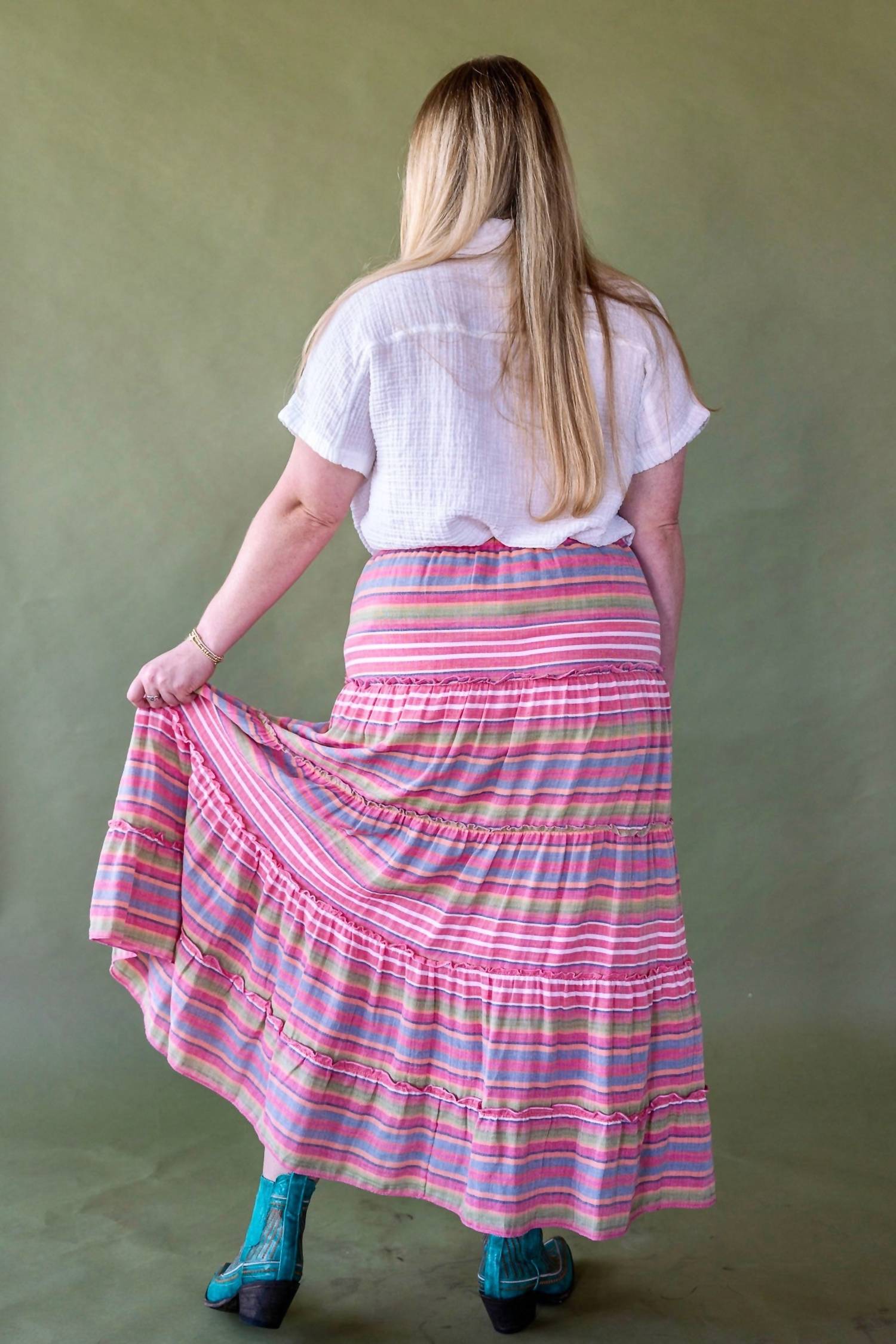 Who doesn't love a good maxi skirt? Introducing the Linen Stripe Skirt by Tasha Polizzi in a vibrant pink hue, perfect for adding a pop of color to any wardrobe. Crafted from 100% linen, this maxi skirt is designed with a stylish tiered silhouette and timeless horizontal stripes, making it ideal for versatile styling. This pull-on skirt features an elastic waistband, ensuring a comfortable and true-to-size fit without pockets. Care for this elegant piece by hand washing in cold water and hanging to dry.