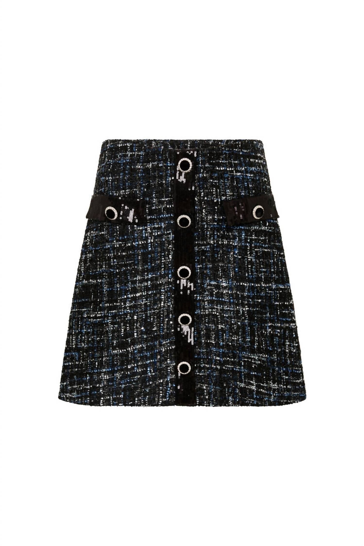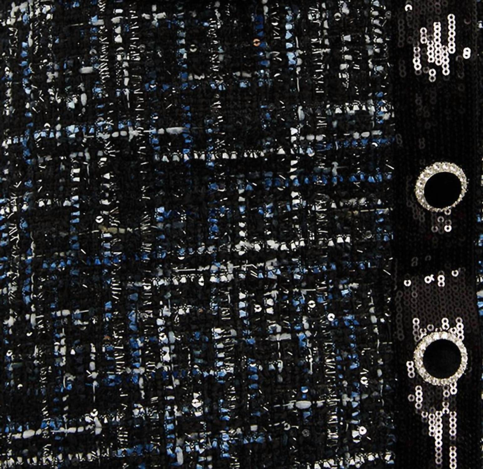 Heavy-weight bonded boucle fabrication. Subtle sequins throughout. Mock front plackets. Velvet-covered diamante buttons. A-line silhouette. 100% Polyester. Fits true to size.