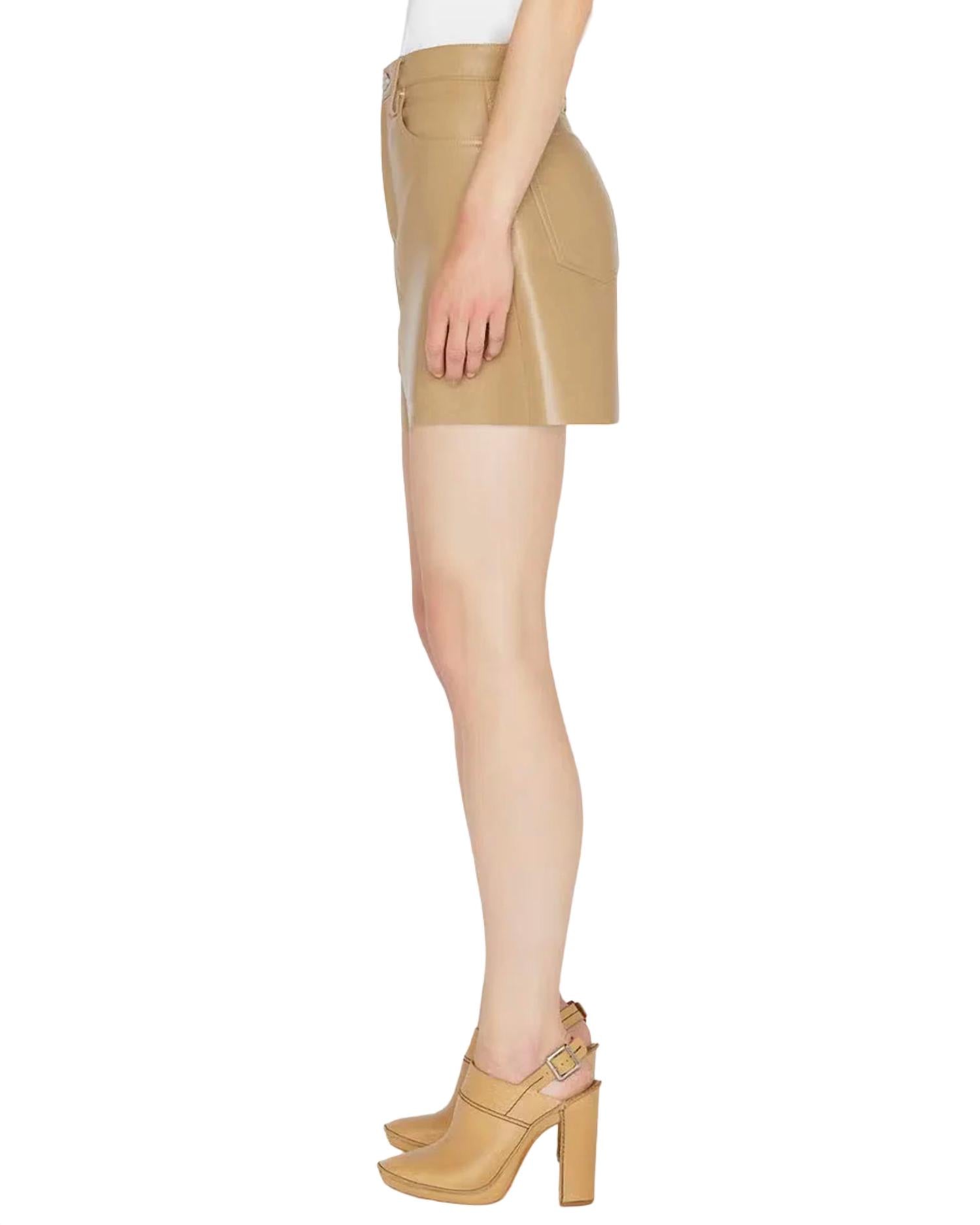 Cinched high rise waist. 5 pocket construction. Asymmetrical seam. Material: 50% Recycled Leather 30% Polyurethane 20% Polyester. Dry clean only.