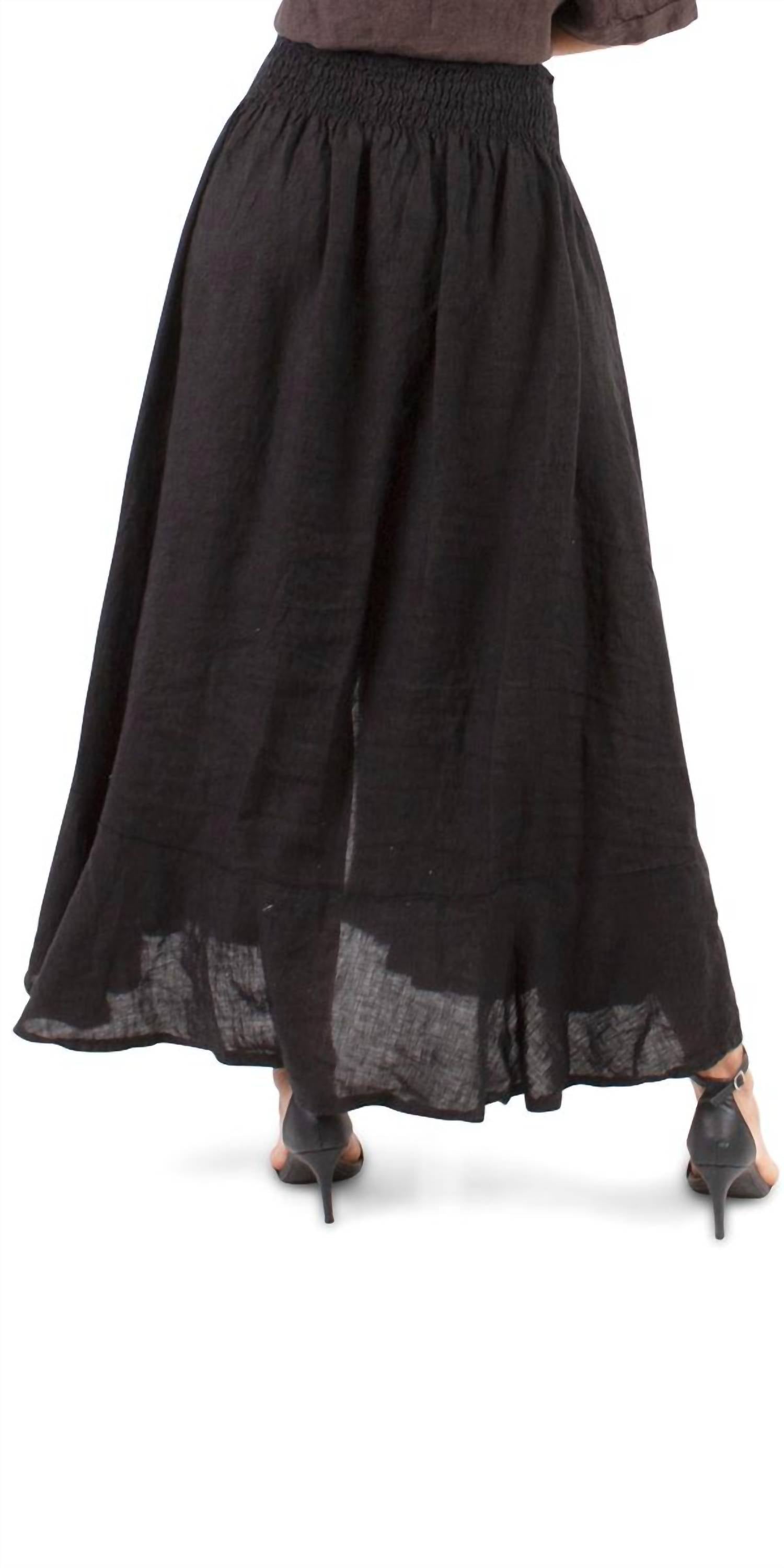 Flowy, comortable and stylish. This maxi skirt is a fan favorite. Elevate your summer wardrobe with the Magdalena Linen Maxi Skirt by GIGI MODA, epitomizing quiet luxury in classic black. This women's petite skirt features a stretch waistline for optimal comfort, adorned with shell buttons, a ruffle hem, and a chic high-low cut. Crafted from 100% linen and made in Italy, it offers both quality and style. Closure: Pull on. Care: Hand wash, line dry. Designed to run large, this one-size-fits-most piece is ideal for any holiday party or the 4th of July. Model height is 5'8".