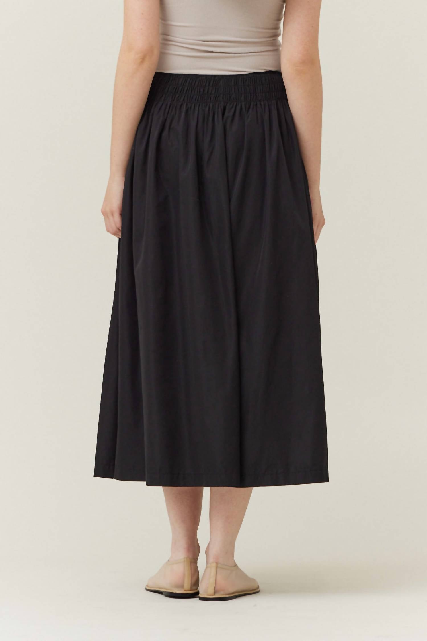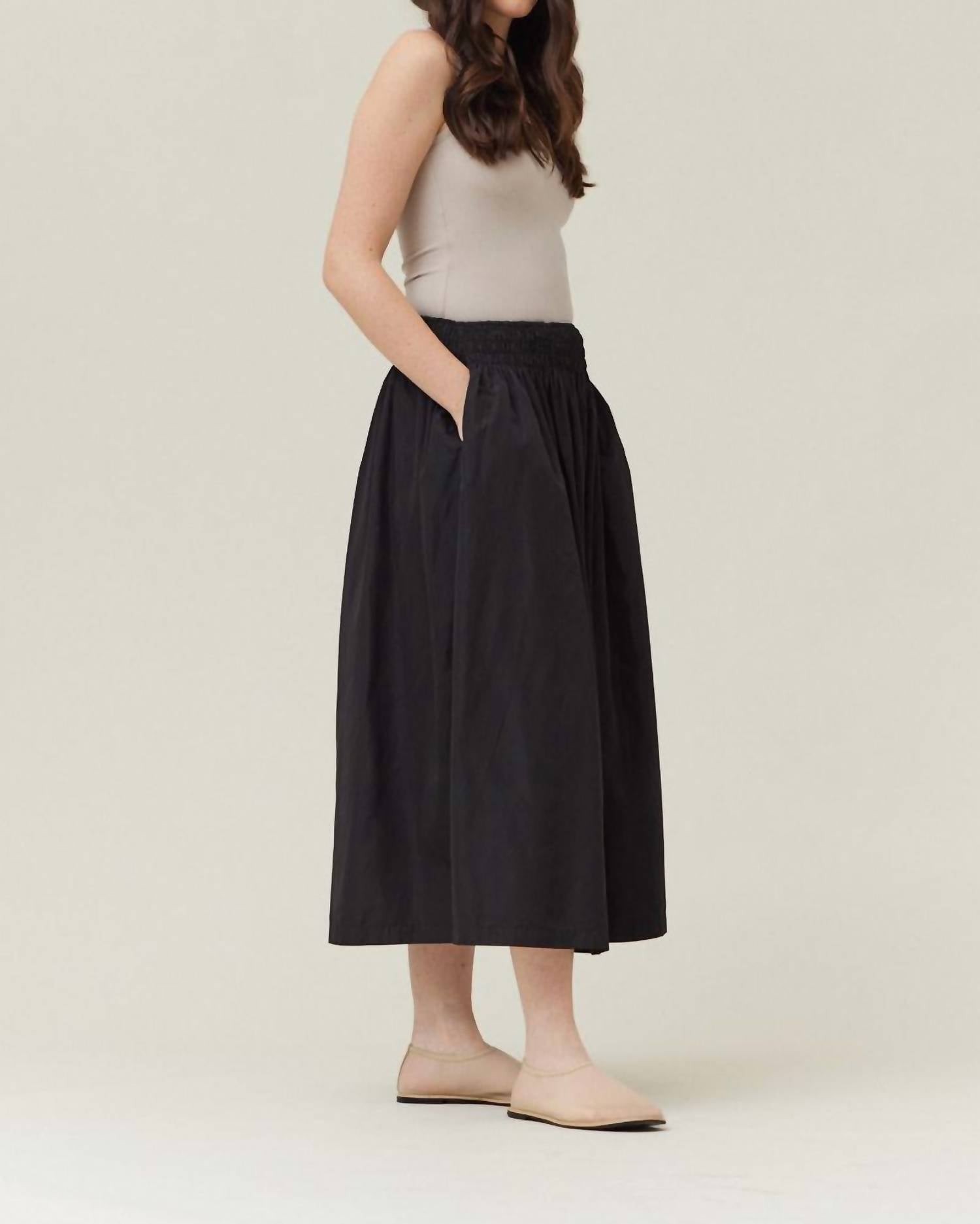 The midi length skirt is here to stay and we especially love this style. Elevate your style with the Smocked Waist Midi Skirt by Grade & Gather, a chic addition to any wardrobe. This women's skirt, designed in a classic black solid pattern, features a flattering smocked waist and convenient pockets. Made from 100% polyester, it promises comfort and style with a pull-on closure for ease of wear. Ideal for versatile looks, this must-have midi skirt effortlessly combines elegance with practicality.