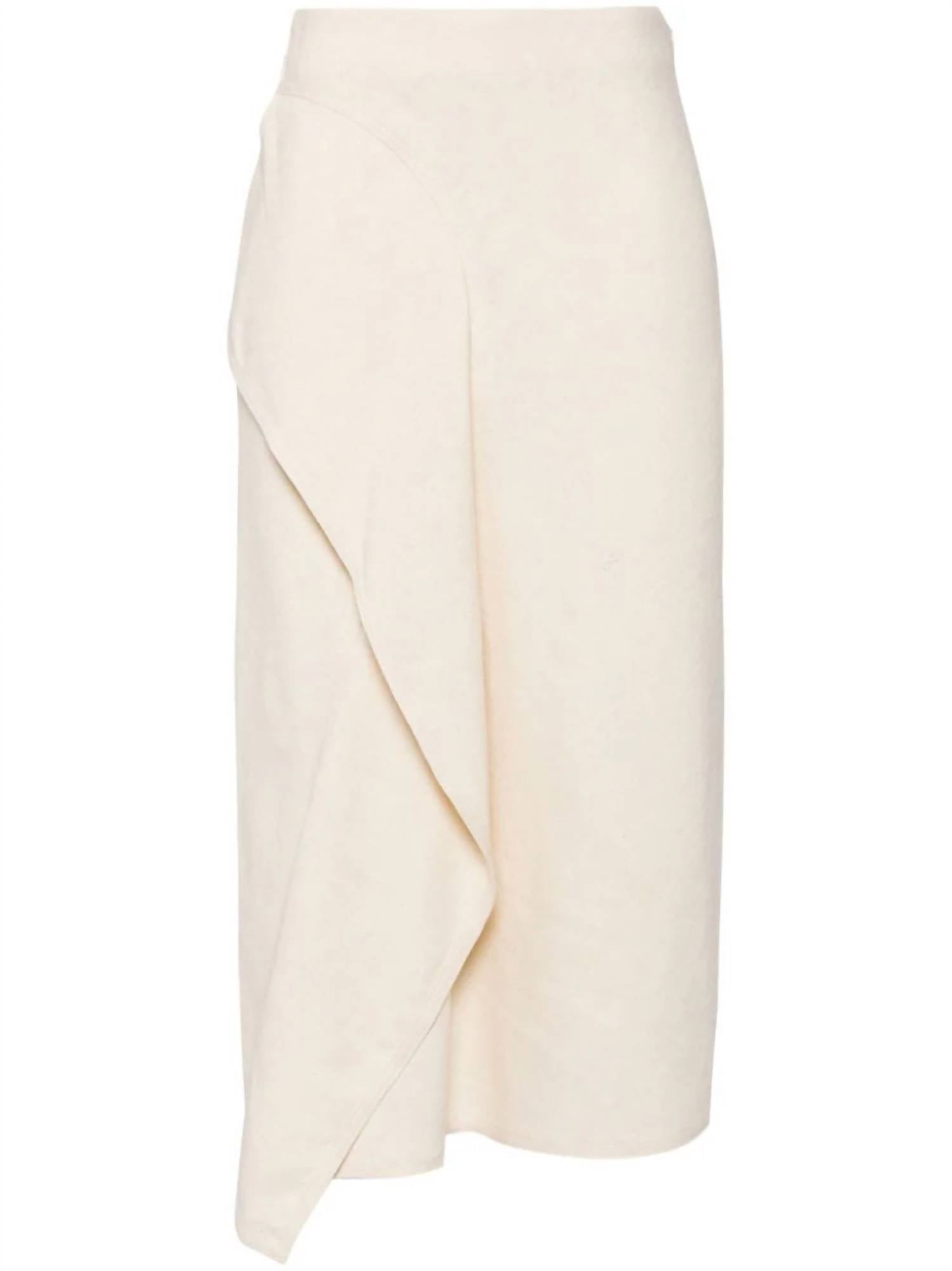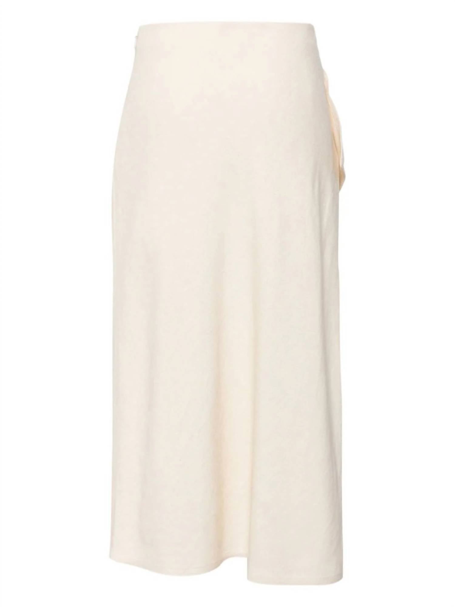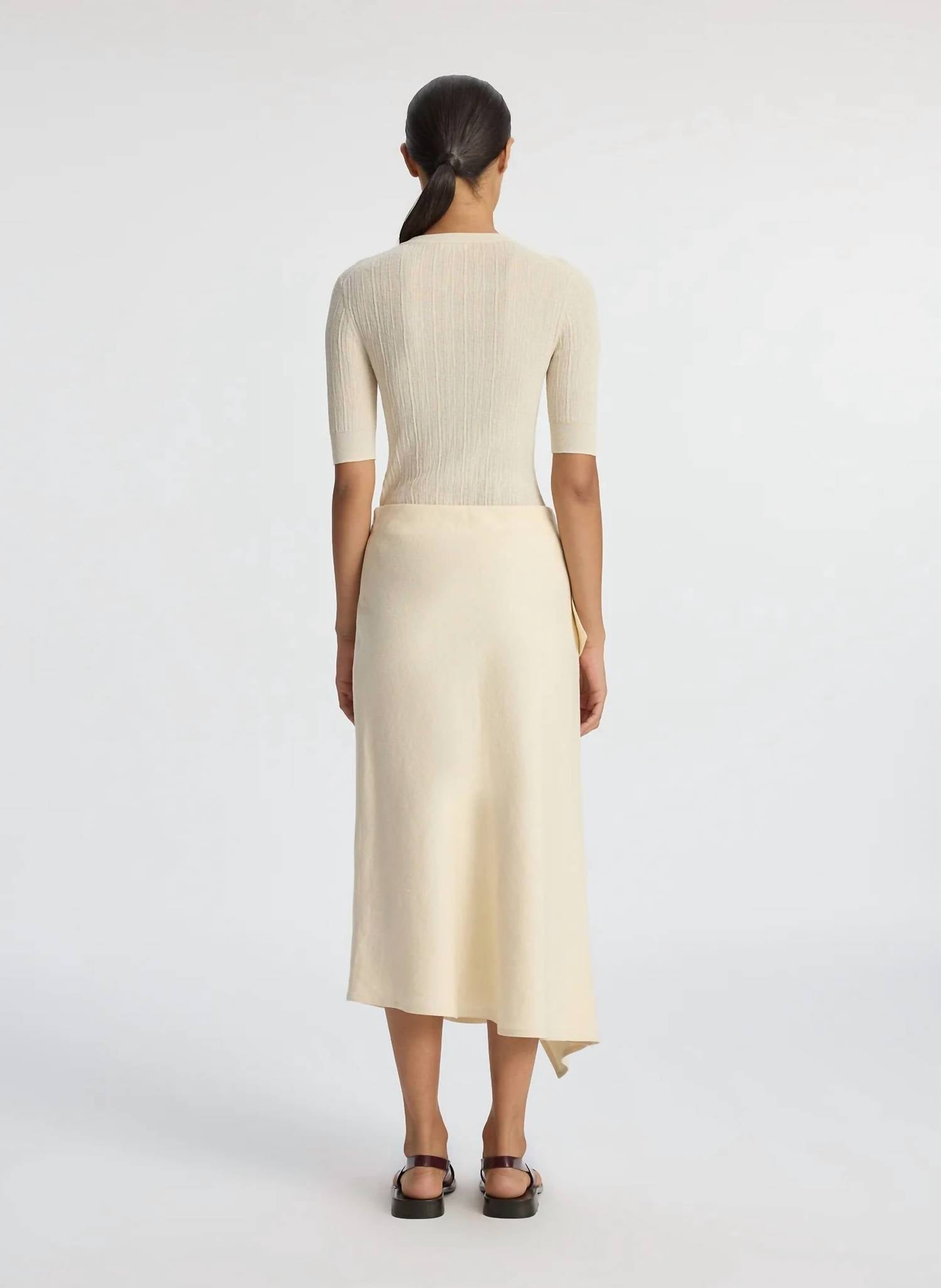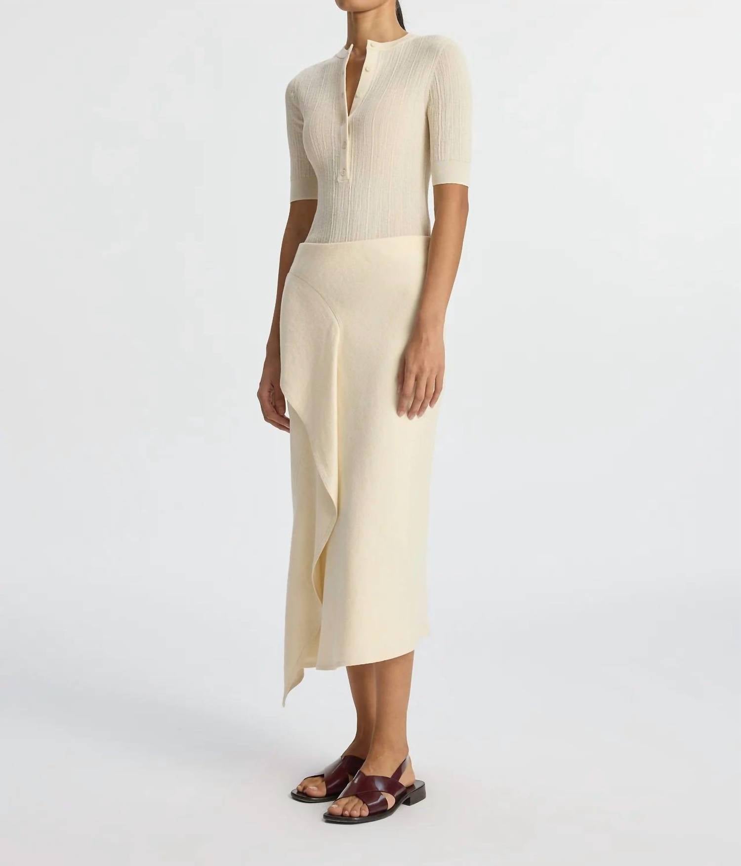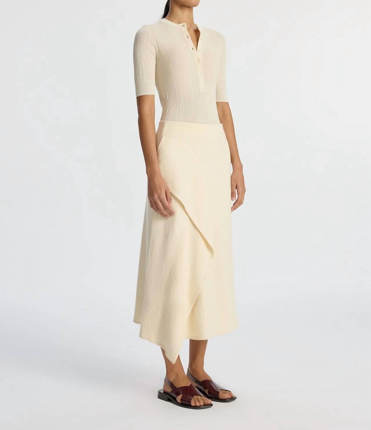 Flowy, comortable and stylish. This maxi skirt is a fan favorite. A.L.C. Lia Skirt. Premium linen-cotton canvas blend. Breathable and structured. Ivory hue for timeless charm. Fully lined midi skirt. High-rise waist accentuates silhouette. Captivating ruffled panel and draped hemline for dynamic flair. Versatile for summer outings or sophisticated events. Effortlessly chic design.
