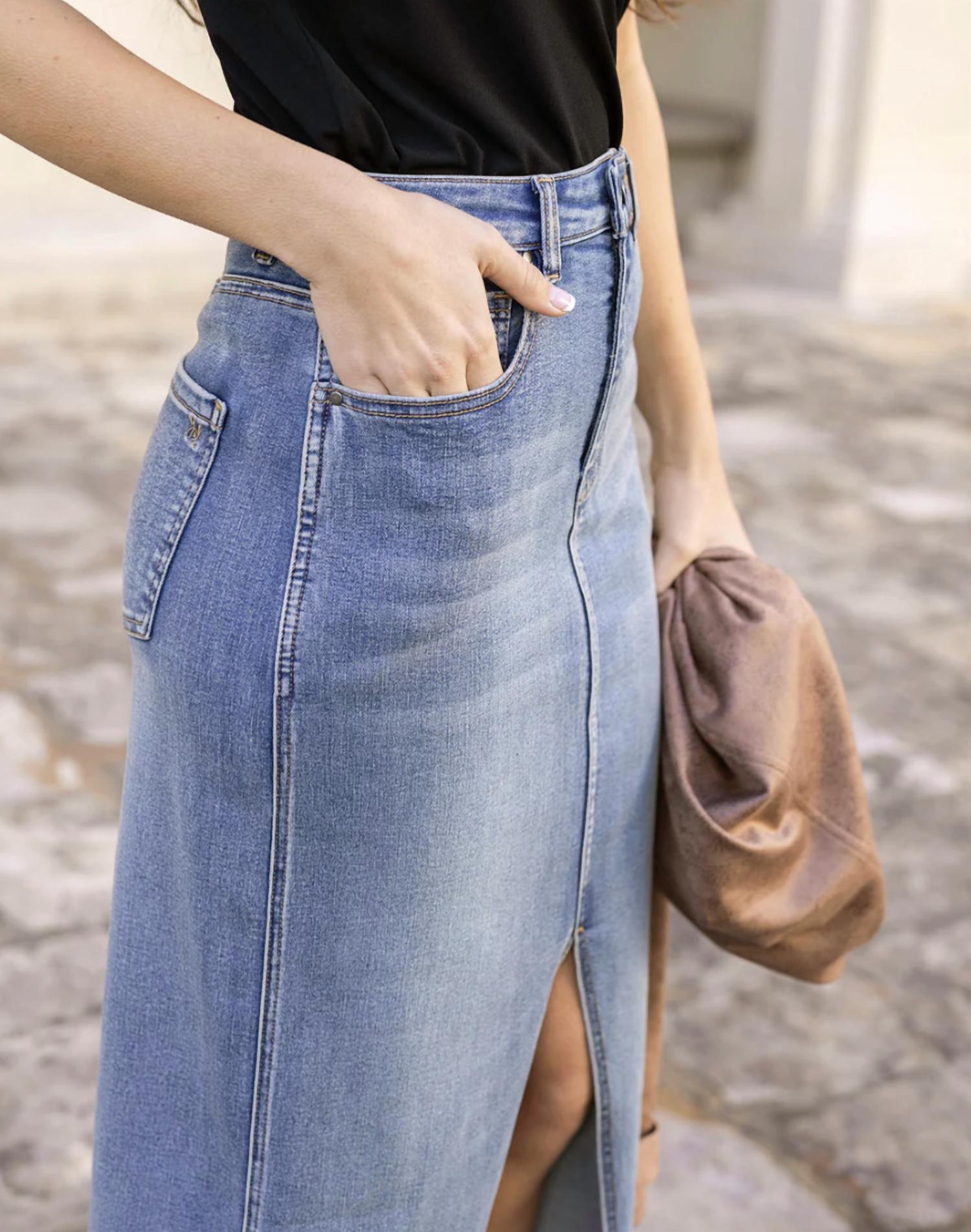 Tuck your favorite tee into this midi length skirt for an effortlessly cool look. Introducing the Denim Midi Skirt by Grace and Lace in a classic medium wash, a timeless piece designed for comfort and versatility. Crafted from a cotton blend featuring 64% cotton, 31% polyester, 3% viscose, and 2% spandex, this skirt offers plenty of stretch for a flattering fit. The midi-length skirt includes a stylish front slit for easy movement, a functional 5-pocket design, and a button closure. Care is simple: machine wash cold on a gentle cycle, tumble dry low, and if needed, use a low iron.