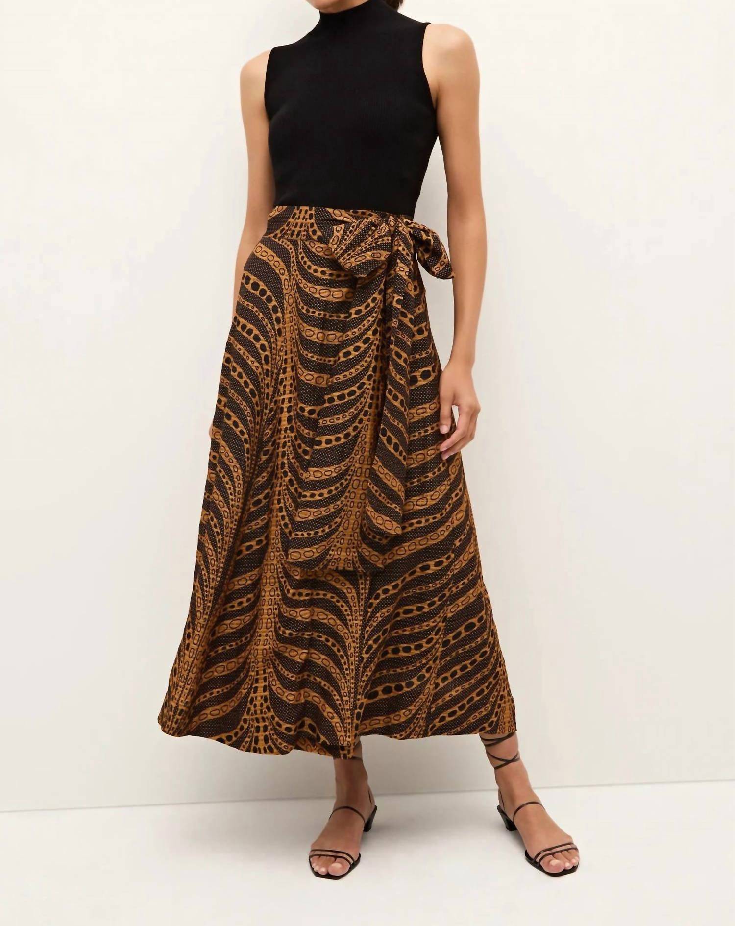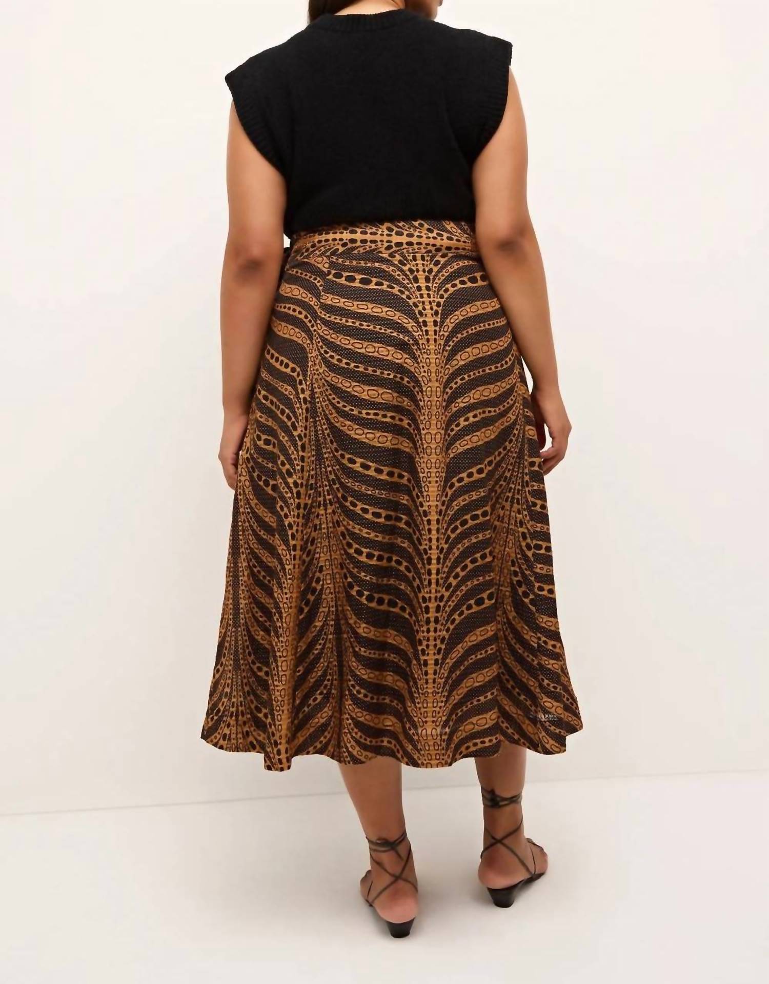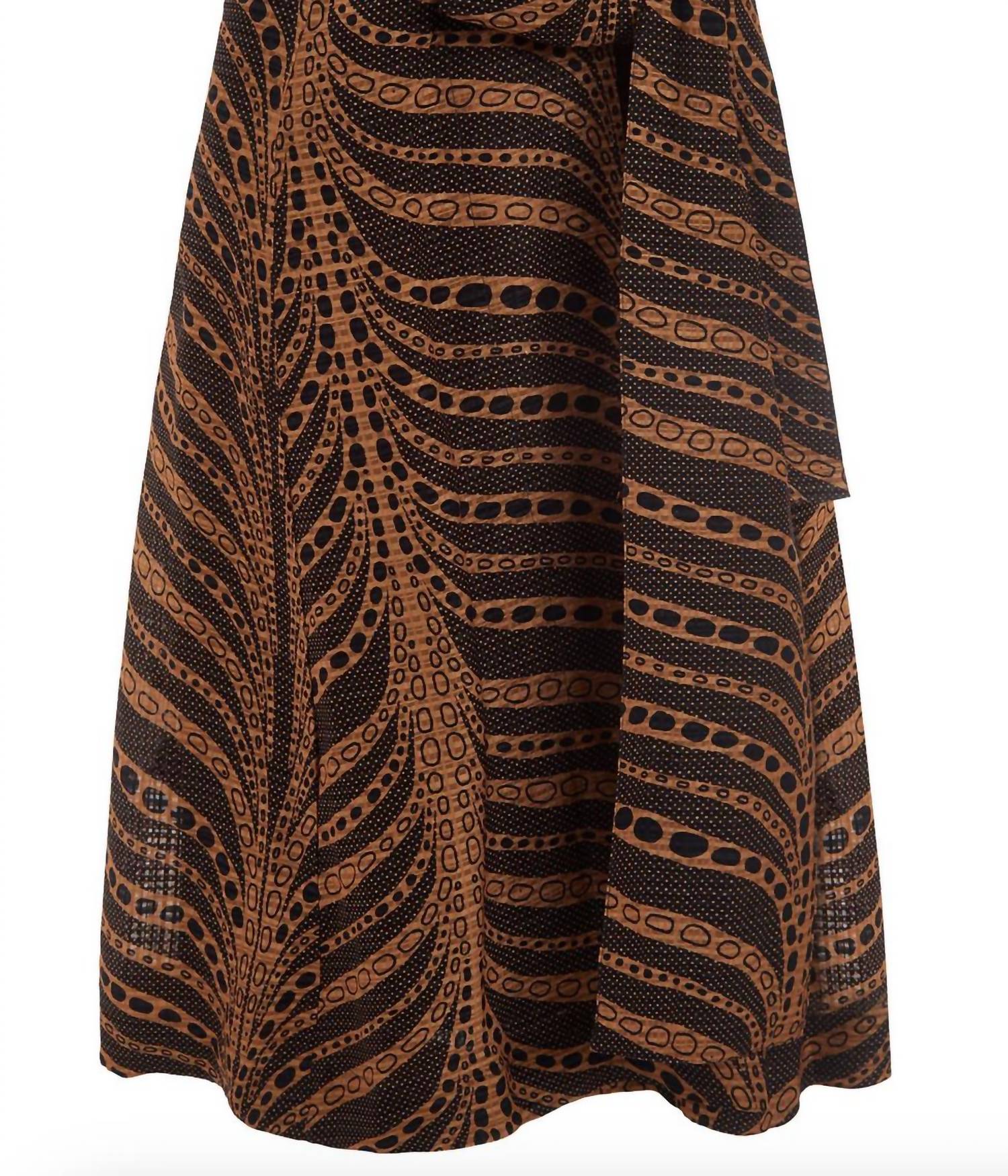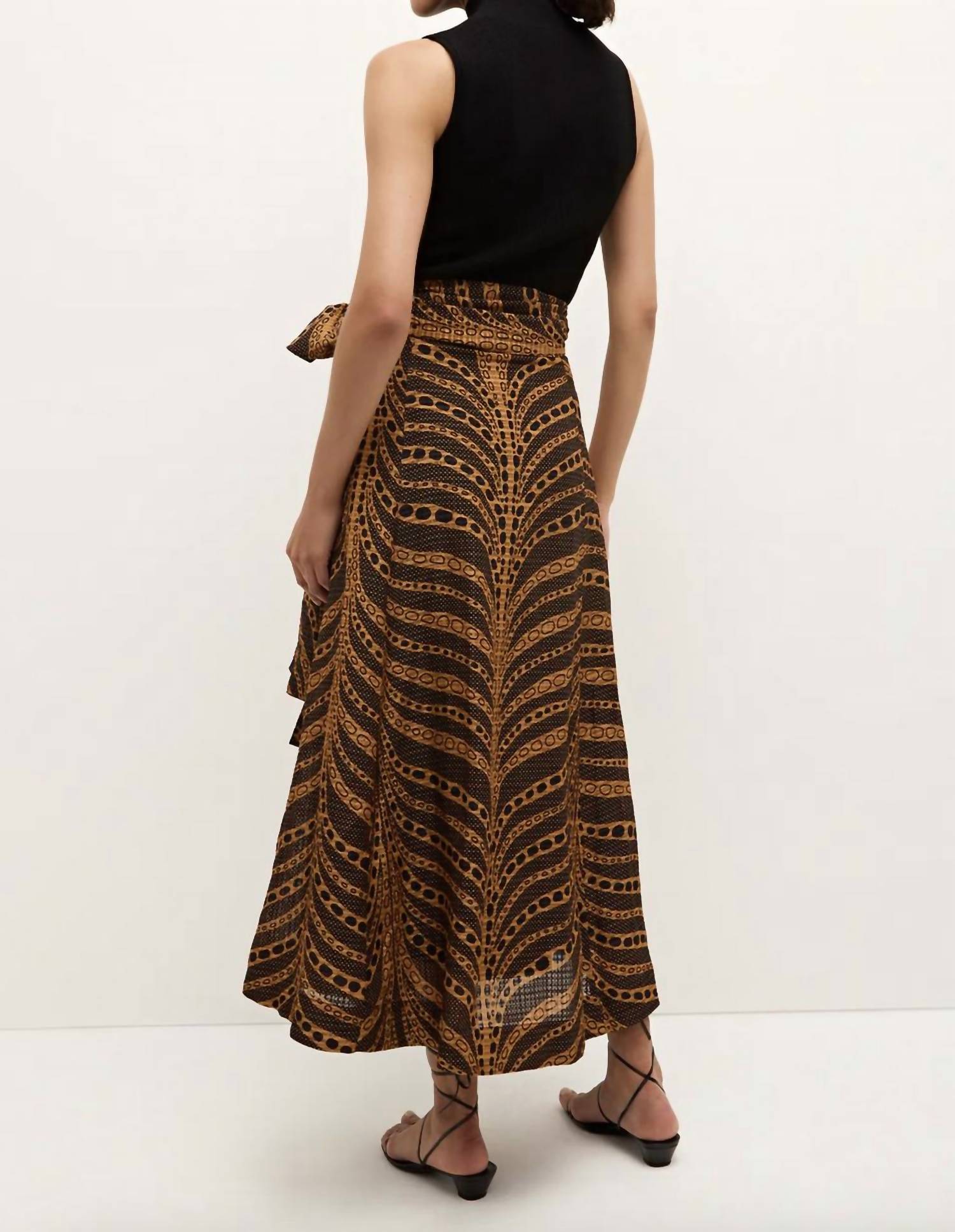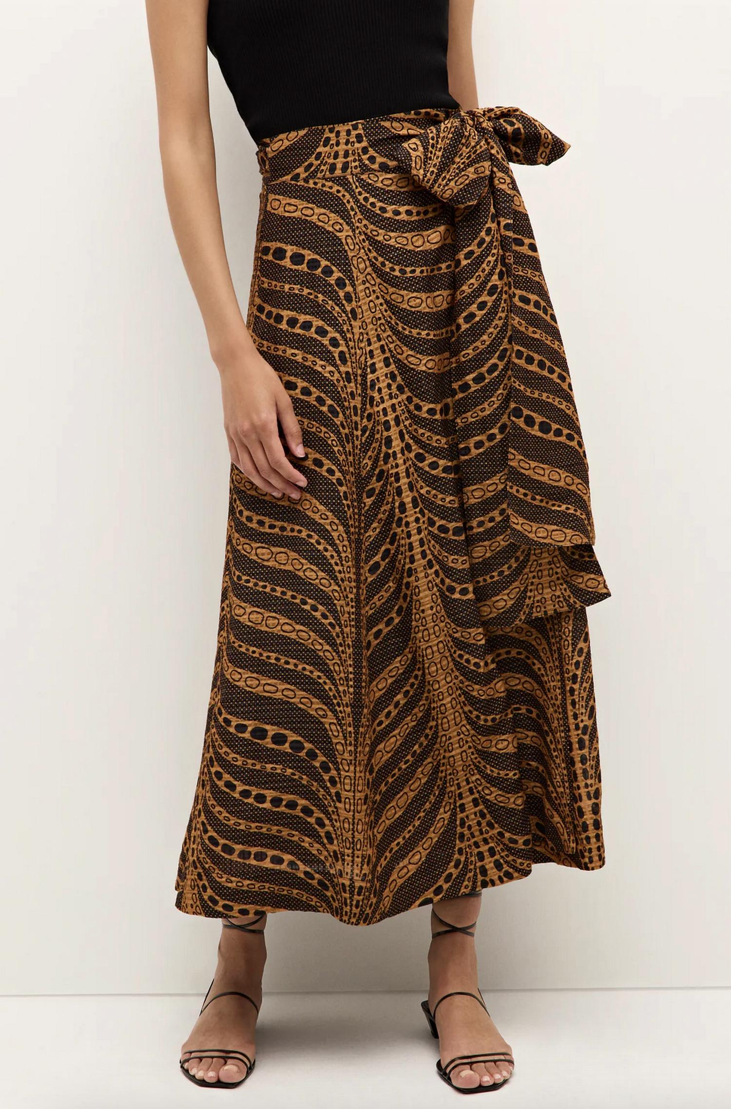 Introducing the Estine Wrap Skirt by Marie Oliver, a perfect blend of style and comfort. Crafted from a rich composition of 56% viscose and 44% linen, this maxi-length skirt showcases the eye-catching Tigris print. It features a traditional paneled design with an adjustable tie belt that elegantly falls into long streamers, allowing versatile styling options. This beautiful patterned piece is lined for added comfort and longevity, with care instructions indicating dry clean only.