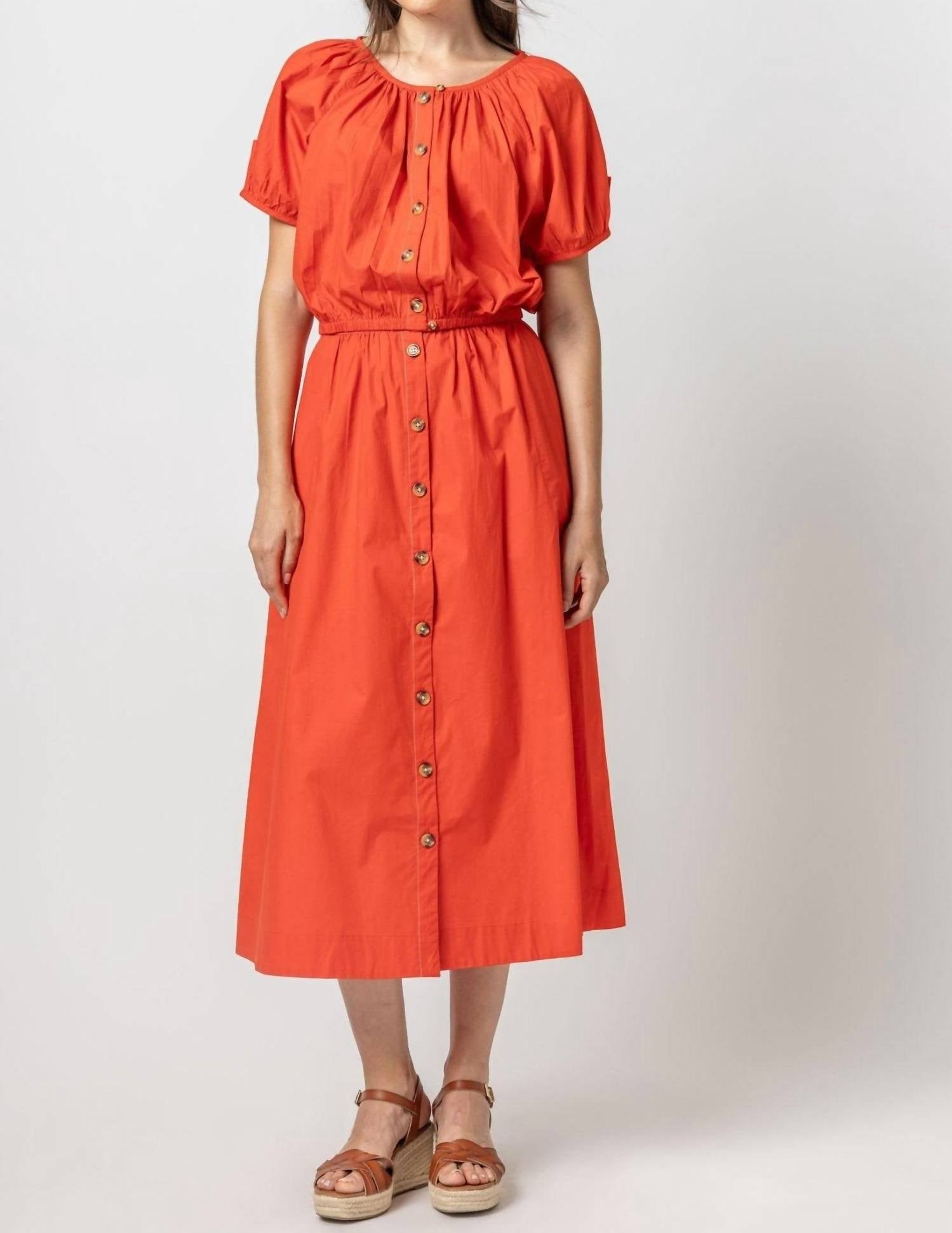 Tuck your favorite tee into this midi length skirt for an effortlessly cool look. The Button Front Midi Skirt by Lilla P offers a vibrant look in a striking poppy hue, perfect for adding a pop of color to your wardrobe. Crafted from 100% cotton in crisp poplin, it promises both comfort and style with a midi length and a relaxed fit. This sophisticated skirt features an elasticized back waist for added ease and a clean button front. Pair it with the coordinating top or your favorite Lilla P tee for a chic and feminine ensemble.