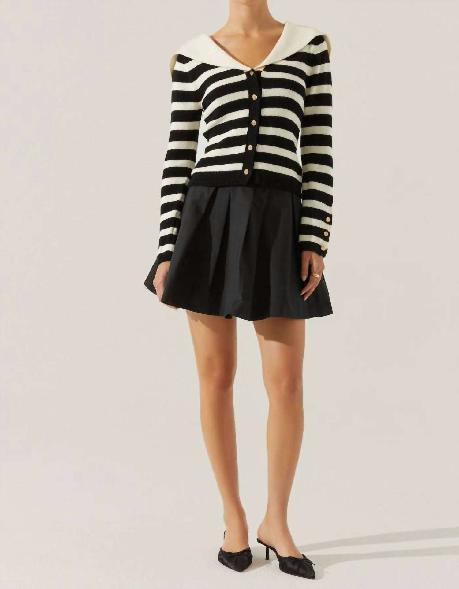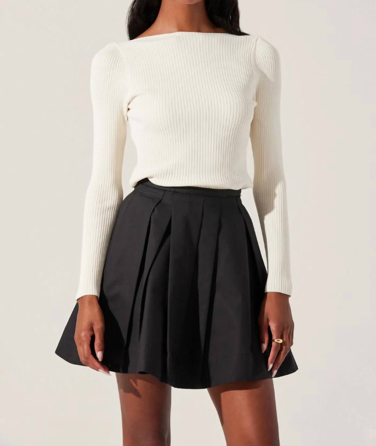 The ASTR Antheia Mini Skirt is a chic addition to your wardrobe, perfect for year-round wear. With its flattering fit and flare silhouette, this solid black skirt features a pleated mini design with a peekaboo layered waistband and practical side pockets. Composition: 100% Cotton. Garment Length: 17 1/8 inches. Closure: Concealed back zipper. Care: Dry clean only. Made to encapsulate French girl style, it's ideal for a minimalist New Year's Eve or any evening event.