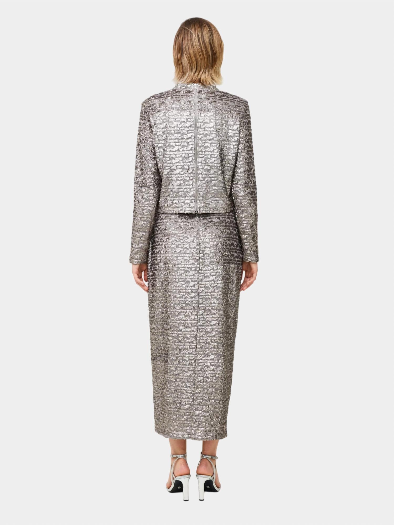 Show off just the right amount of skin in this beautifuly designed midi length skirt. A-line silhouette. Sequin embellishment, shiny, and silver. Back zip closure. Side slit. Midi length. Mid-rise. Lined. 100% polyester.
