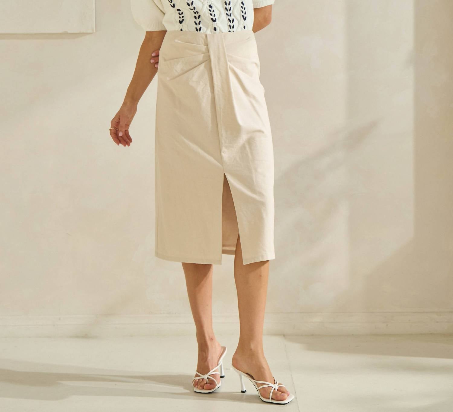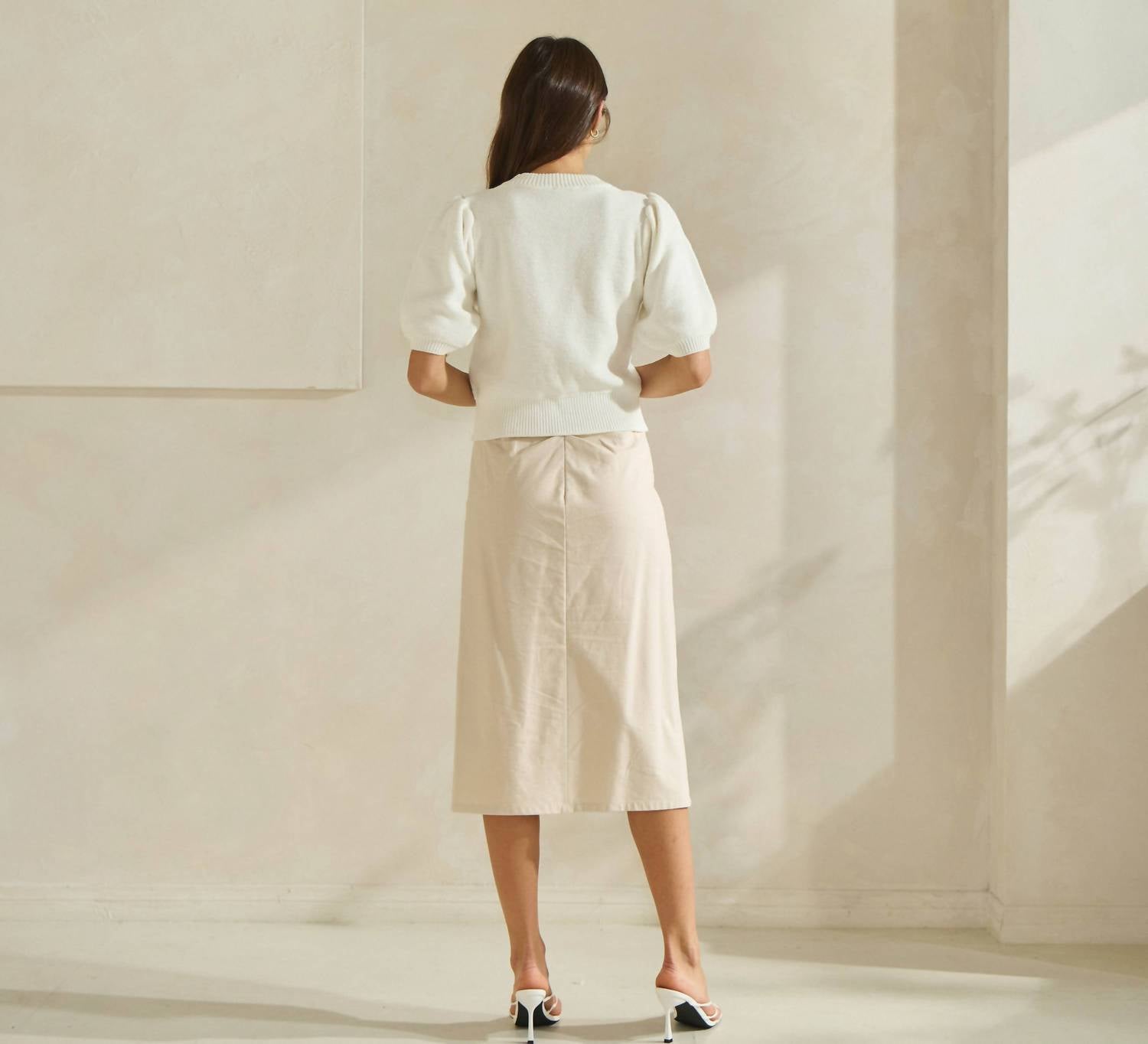 Show off just the right amount of skin in this beautifuly designed midi length skirt. Elevate your style with the Begged and Pleated Midi Skirt by ABLE, crafted for a sophisticated look in versatile Ecru. This women's skirt features a sleek front slit and pleated detailing, creating an elegant silhouette. Composition: Polyurethane. Closure: Hidden back zipper. Care: Machine wash, line dry. Model is wearing a US size Small (5'8" tall).