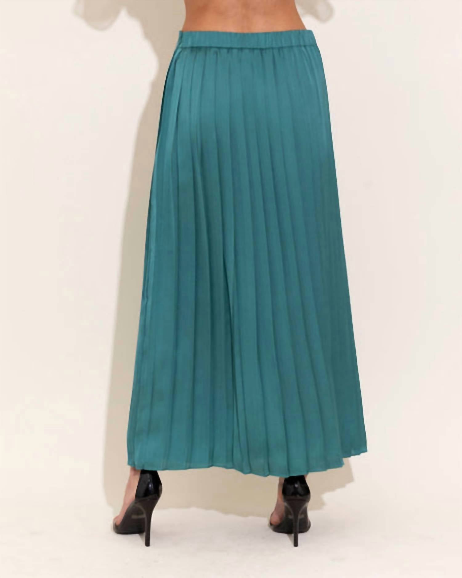 Tuck in your favorite tee for a more casual yet feminine look. Elevate your wardrobe with the McNeil Pleated Skirt by Alden Adair, a stunning piece in vibrant beryl. Crafted from 100% Polyester in Poly Charmeuse, this midi skirt offers elegant movement and texture with its pleats. Designed for comfort, it features a pull-on closure and is perfect for a range of occasions. Care for it easily with a machine wash. Model is wearing a size small.