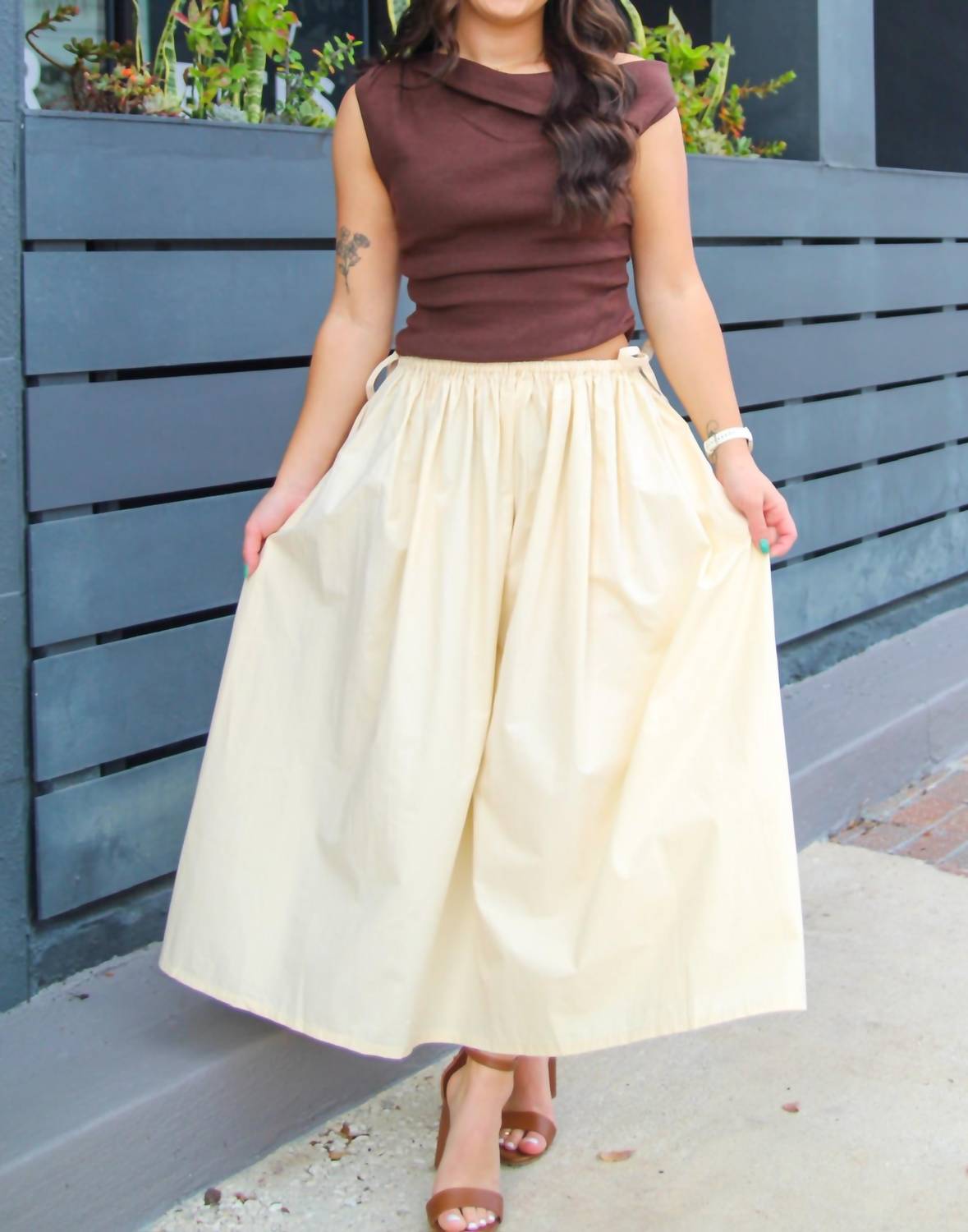 Embrace effortless elegance with the Kiana Side Tie Skirt by All : Row, a romantic addition to your wardrobe. This cream-colored, lightweight, flowy skirt is crafted from cotton and features a comfortable elastic waistband with a drawstring detail. Its functional side pockets and midi length add practical style, perfect for pairing with fitted tops or cropped tees. Ideal for summer vacations, this A-line piece embodies boho chic charm.