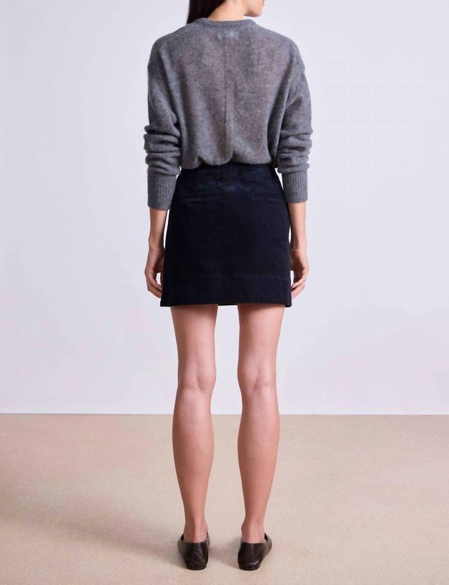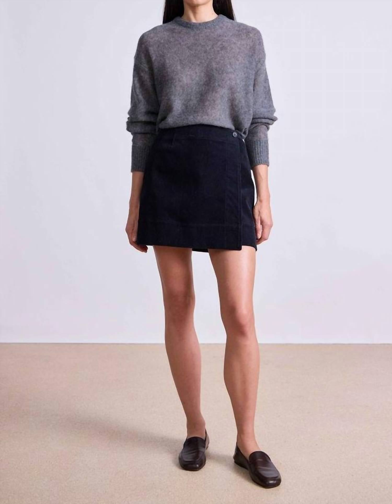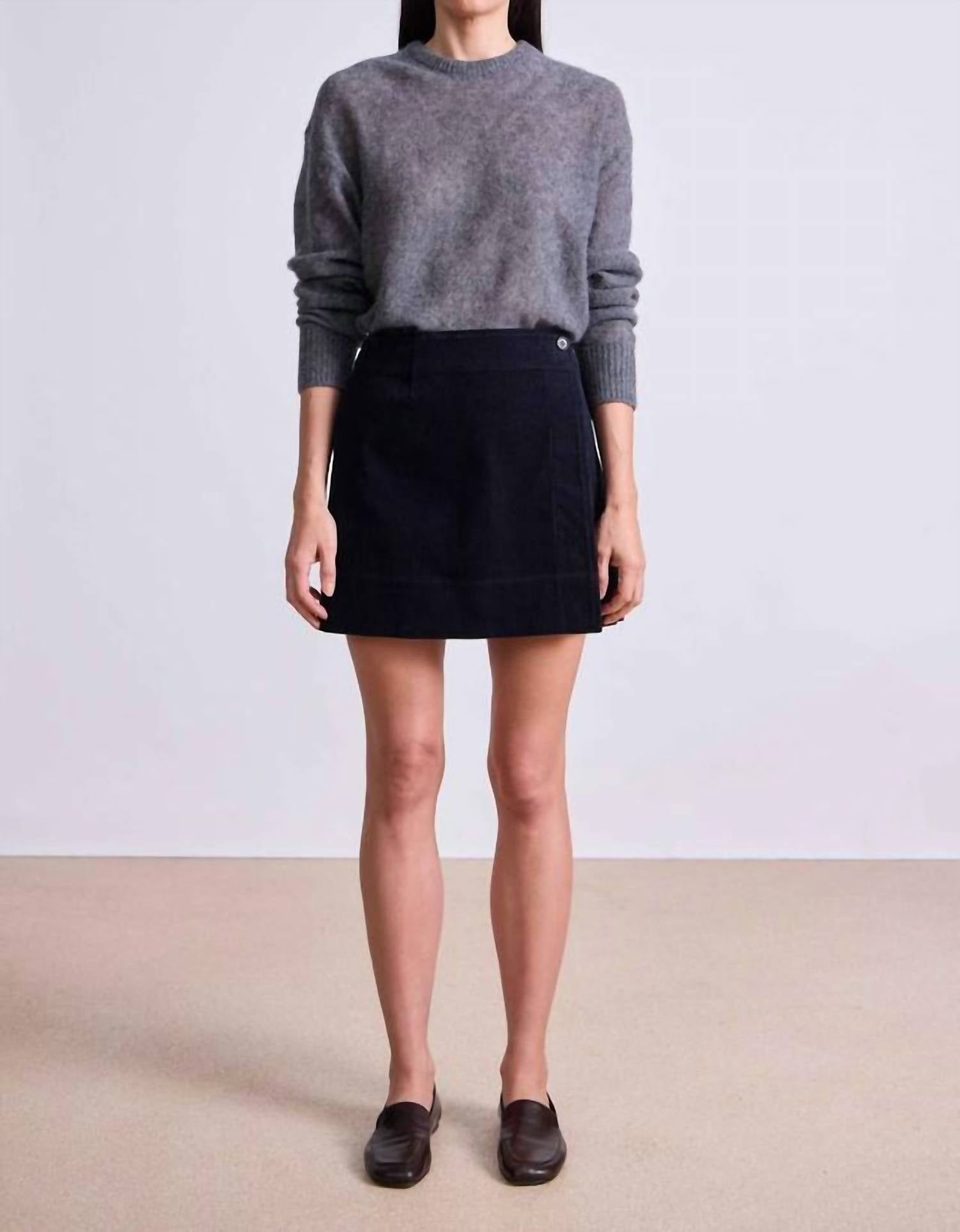 Tuck in your favorite tee for a more laid-back vibe. Discover the APIECE APART Marta Mini Skirt in Midnight, a stunning example of minimalist elegance. This mini-length skirt features a fitted silhouette with a cross-over flap and button closure, making it both stylish and tailored. Crafted from a luxurious wool and linen blend, it is made in China and designed with thoughtful touches like back welt pockets and side slits. For optimal care, dry clean only. The model is 5'10" and wearing a size 4, showcasing its true-to-size fit. 53% Wool 47% Linen.