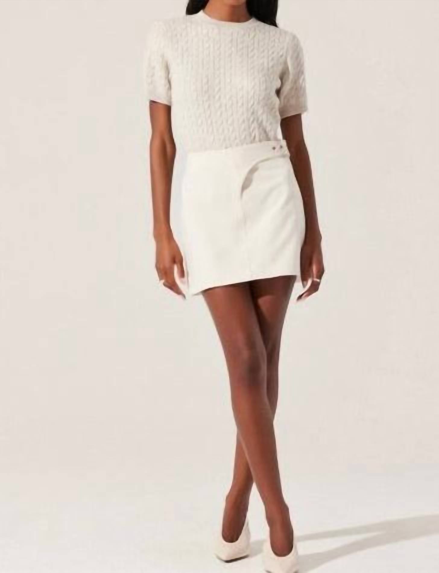 Show just the right amount of leg in this fit flattering mini. Meet the Sevyn Mini Skirt by ASTR, a chic cream-colored piece perfect for a stylish dinner party. This women's skirt features a back zip closure and a wrap style with an asymmetrical buckle, enhancing its modern pencil fit. Made from 76% Polyester, 19% Rayon, and 5% Elastane, this imported skirt offers a flattering silhouette. Care: Dry clean only. Model Hannah is 5'5", with measurements 32" bust, 25" waist, 29" hips, wearing a size x-small, true to size.