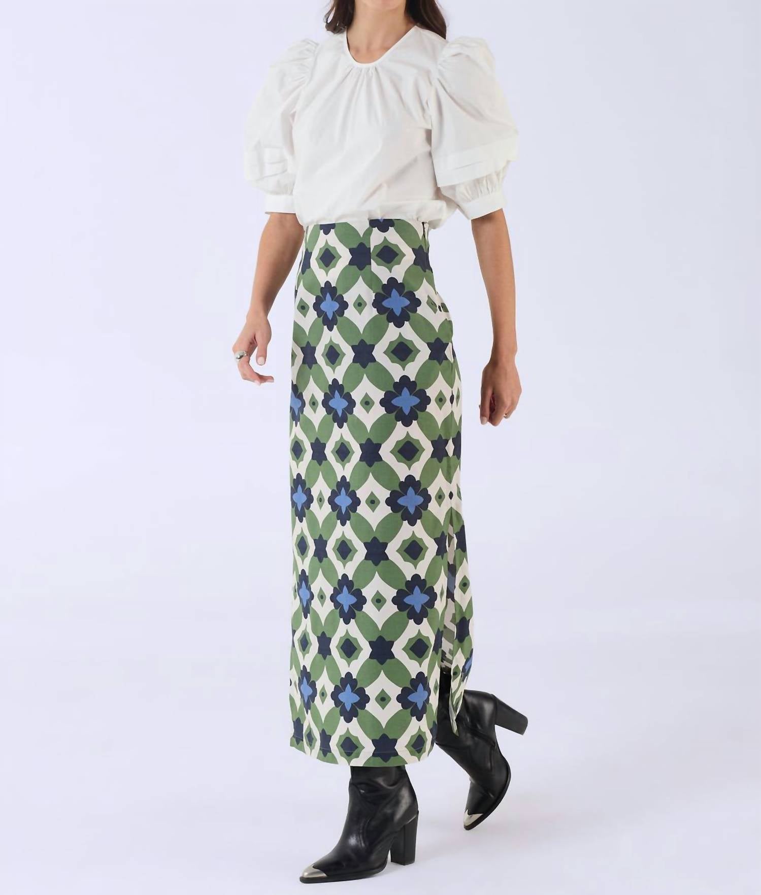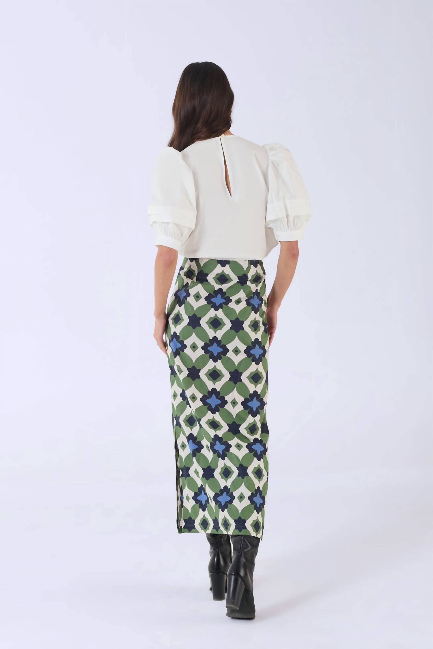 Show off just the right amount of skin in this beautifuly designed midi length skirt. The Aspen Skirt by BEYOND by Vera is a sophisticated midi skirt in a stunning Mosaic Green, tailored for the modern woman. Crafted from breathable cotton, this skirt features a sleek fitted silhouette with side slits, offering both elegance and ease of movement. The skirt is patterned, embodying a contemporary take on nature's designs, perfect for a chic, boho-chic style. Closure is provided with a side zipper, and it is best maintained by hand washing and line drying.