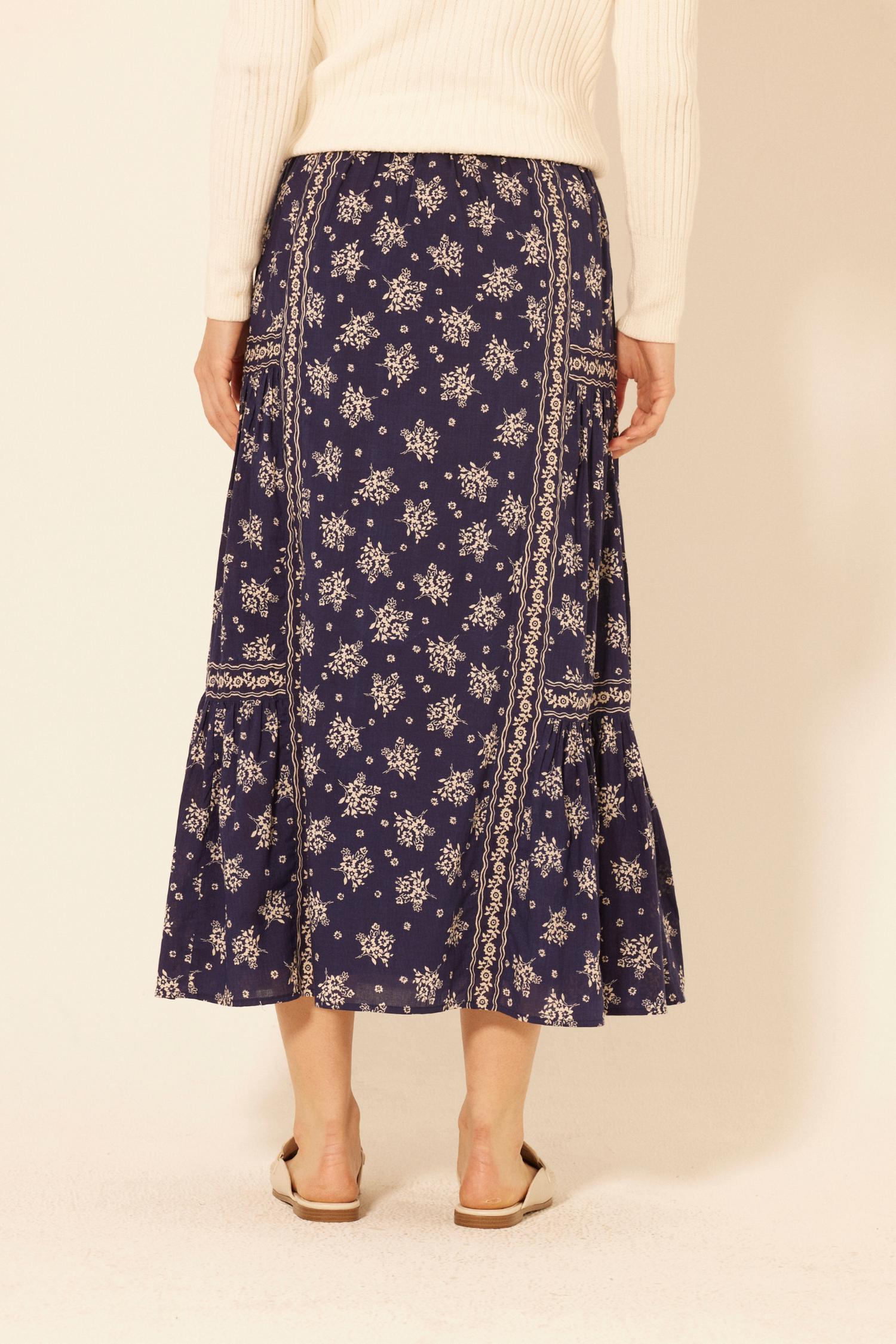 This asymmetrical skirt will take you from desk to dinner. Enhance your boho chic wardrobe with the Valley Crest Skirt by BILA77, a delightful choice for cocktail parties or casual outings. This asymmetrical indigo skirt is crafted from 100% BCI cotton, featuring a floral pattern and convenient pockets for added style and functionality. Closure: Easy pull-on design ensures a comfortable fit. Care: Hand wash and line dry to maintain its vibrant charm.