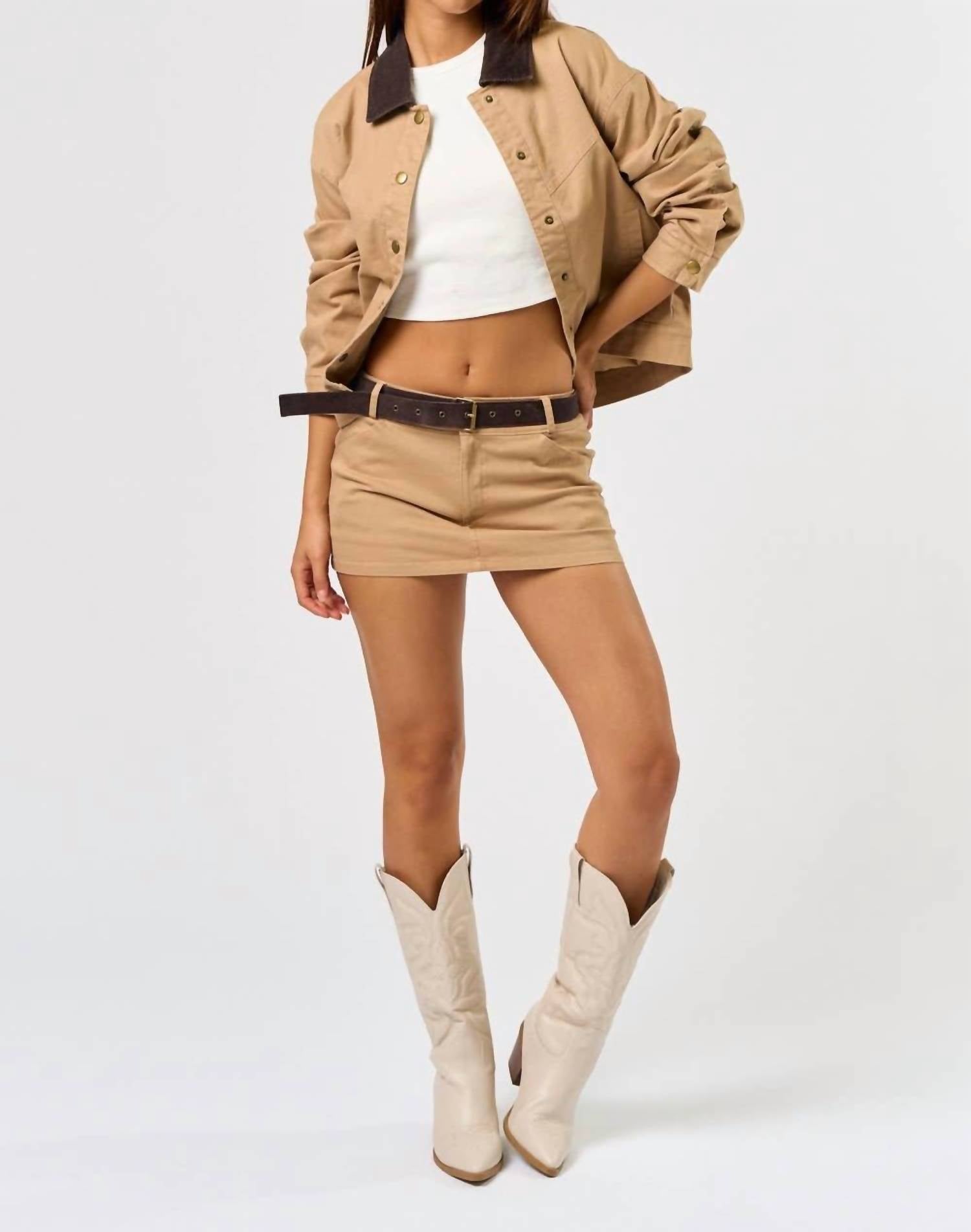 Tuck in your favorite tee for a more laid-back vibe. Introducing the Barnyard Mini Skirt by Blue Blush, a chic and trendy choice for concert occasions and more. Crafted in a solid khaki hue with a western flair, this skirt features a textured corduroy belt and comes complete with built-in shorts for added comfort. Made for women, it is designed with a convenient zip closure, making getting dressed a breeze. Care for this stylish piece is easy with machine wash and tumble dry instructions.