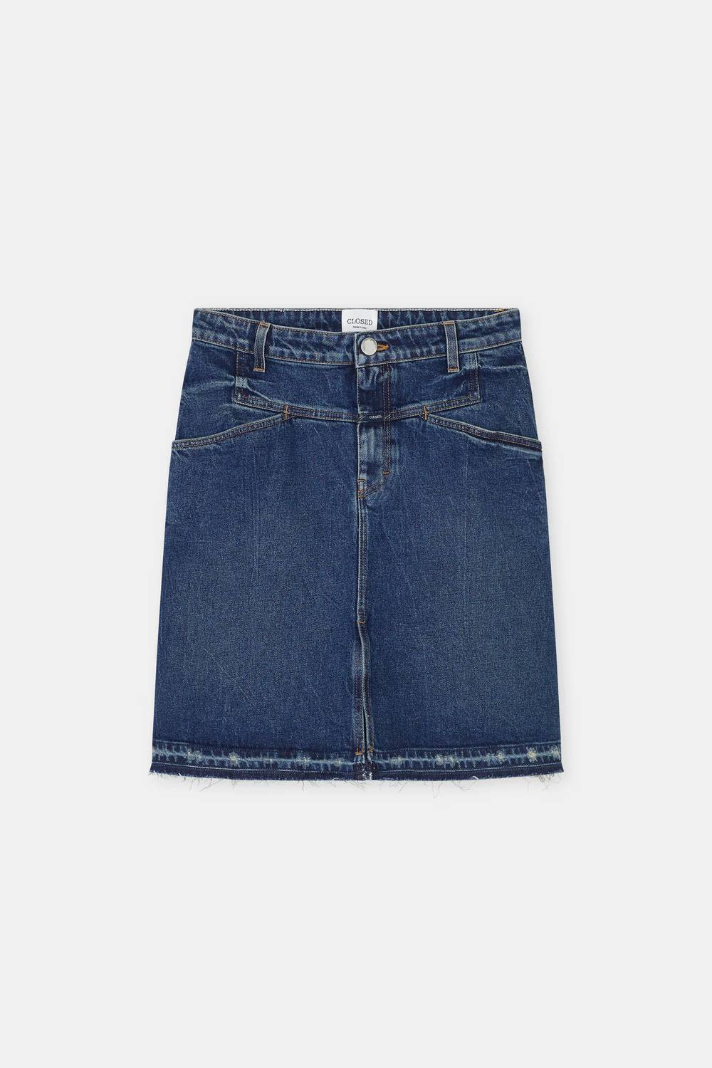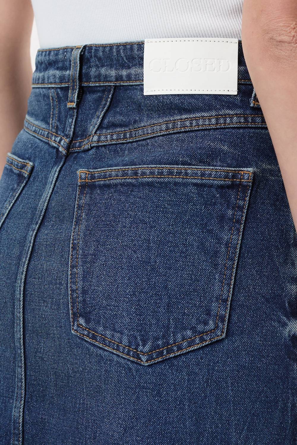 Tuck in your favorite tee for a more laid-back vibe. The Stover-x Skirt by CLOSED is a versatile mini skirt perfect for any occasion. Made from a blend of 79% Cotton, 20% Recycled Cotton, and 1% Elastane, it offers a soft stretch feel for superior comfort. The high-rise, A-line fit features a relaxed silhouette with X-style pockets and a vented hem, enhancing its classic appeal. Closure: Zip fly with button. Care: Machine wash cold, tumble dry.
