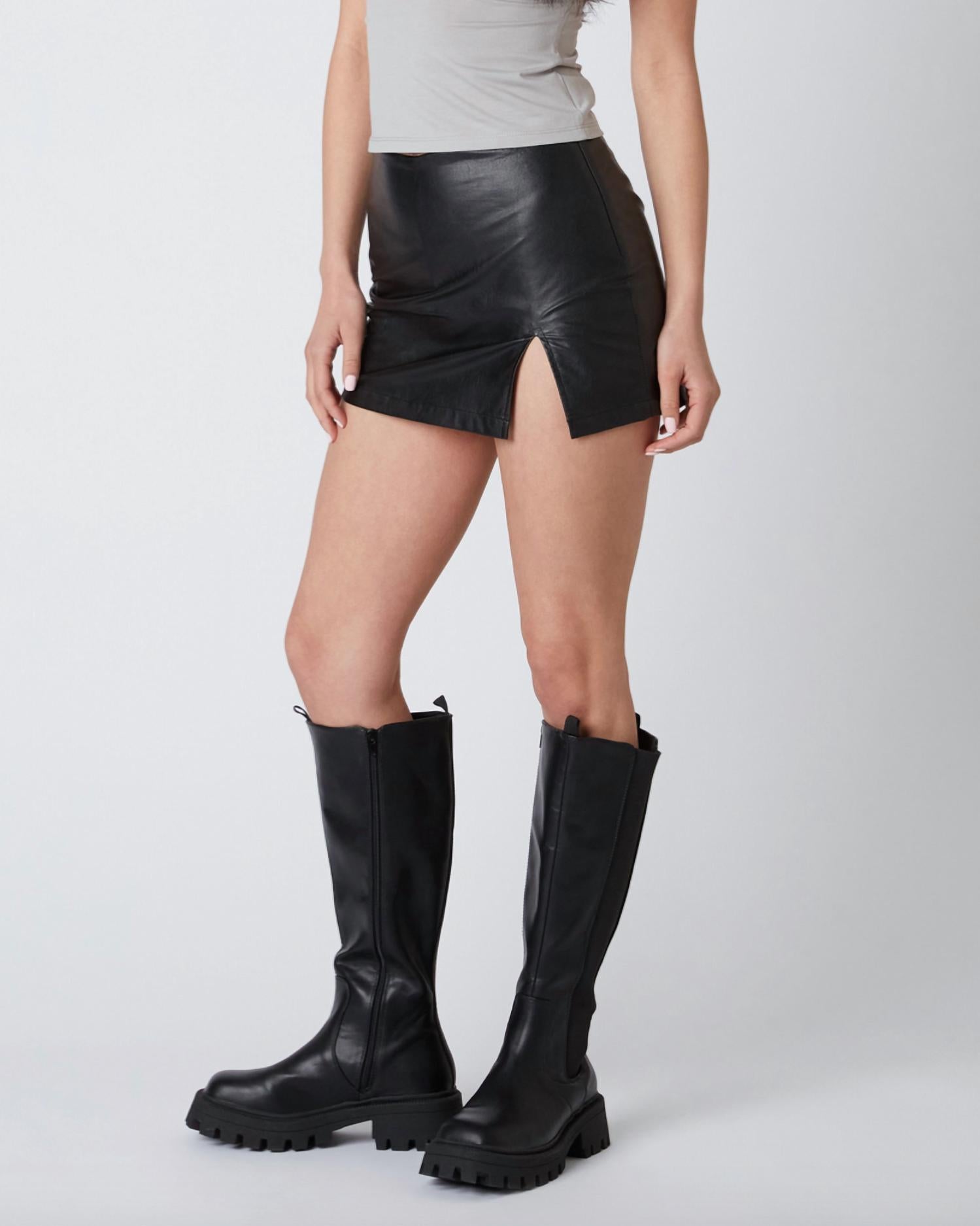 Show just the right amount of leg in this fit flattering mini. The Side Slit Mini Skirt by Cotton Candy LA is a bold addition to your wardrobe in a rich brown hue. Crafted from high-quality polyurethane, this solid-patterned mini skirt is designed with a daring side slit for an edgy flair. The side zipper closure ensures a sleek fit perfect for any occasion, whether it's a casual day out or a stylish night. Care instructions recommend hand washing and line drying to maintain its form and texture.