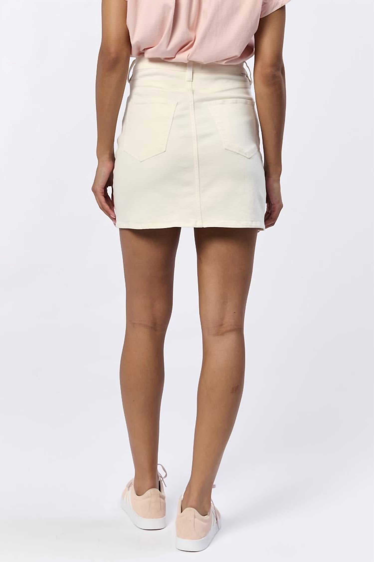Tuck in your favorite tee for a more laid-back vibe. The Quinn Denim Mini Skirt by Dear John Denim exudes minimalist charm with its classic ivory hue, perfect for a Thanksgiving gathering or holiday party. Crafted from a comfortable cotton blend comprising 90% Cotton, 8% Polyester, and 2% Spandex, this skirt includes practical pockets and features a button closure for a secure fit. Its machine washability and hang dry instructions, combined with a warm iron option, make for easy maintenance without compromising style. Ideal for spring, this solid-patterned skirt runs true to size and is a versatile staple for any woman's wardrobe.