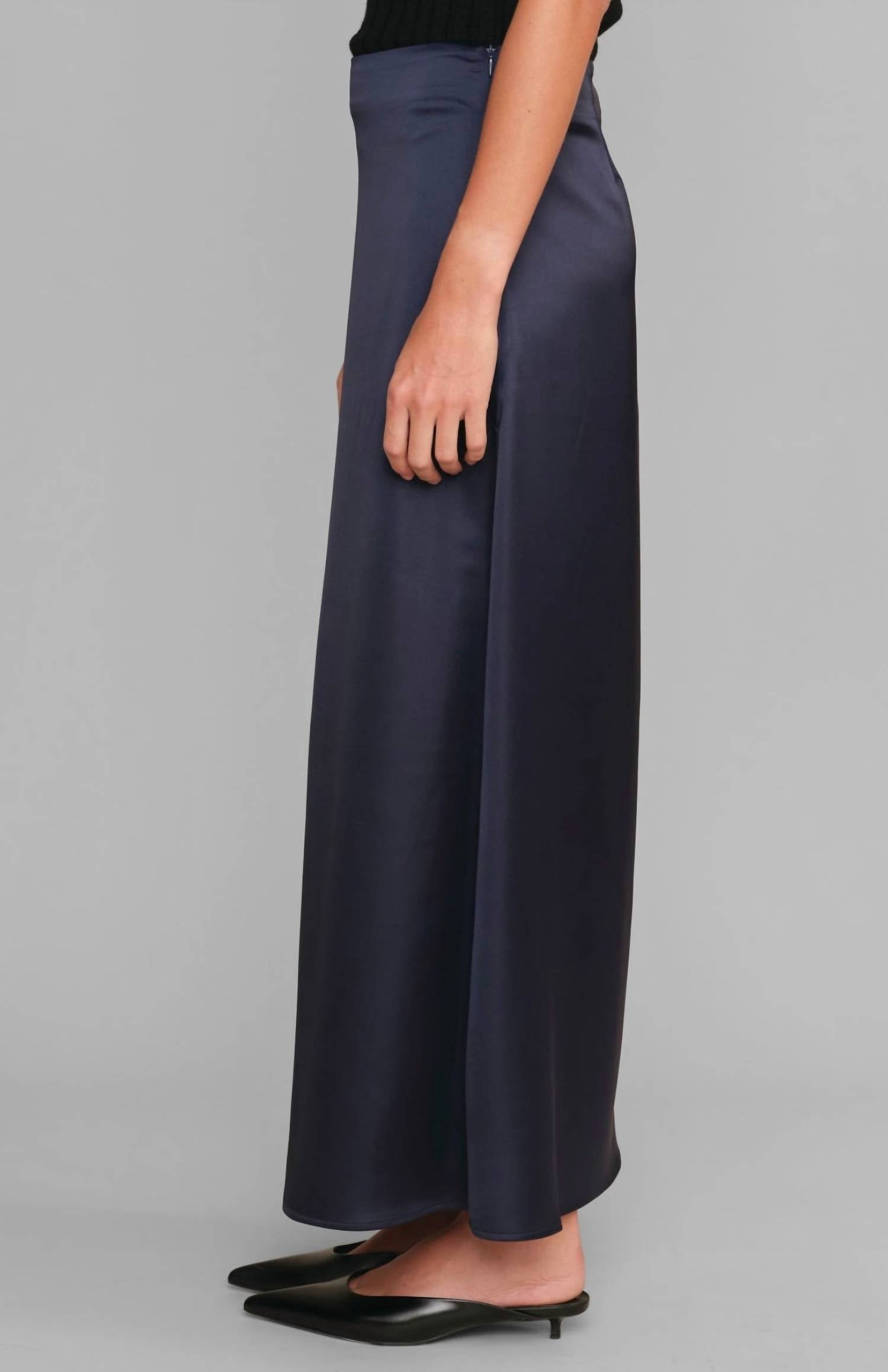 Tuck in your favorite tee for a more casual yet feminine look. Elevate your evening event wardrobe with the Marcus Maxi Skirt by DELUC, a minimalist piece perfect for the fall season. This stunning solid navy skirt is crafted from 97% Polyester and 3% Spandex, offering a sleek and comfortable fit. Designed for women, it features a convenient side zipper closure. Care instructions include a gentle hand wash and line dry to maintain its elegance.