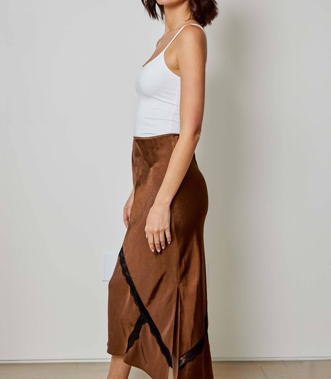 Show off just the right amount of skin in this beautifuly designed midi length skirt. Elevate your wardrobe with the Katarina Midi Skirt by dh NEW YORK in a rich Chocolate Combo. This women's bias cut satin skirt features a textured finish with a stylish lace insert. Made from 100% polyester, it offers a convenient pull-on closure. For care, please dry clean only for best results.