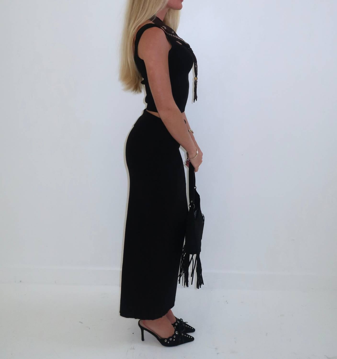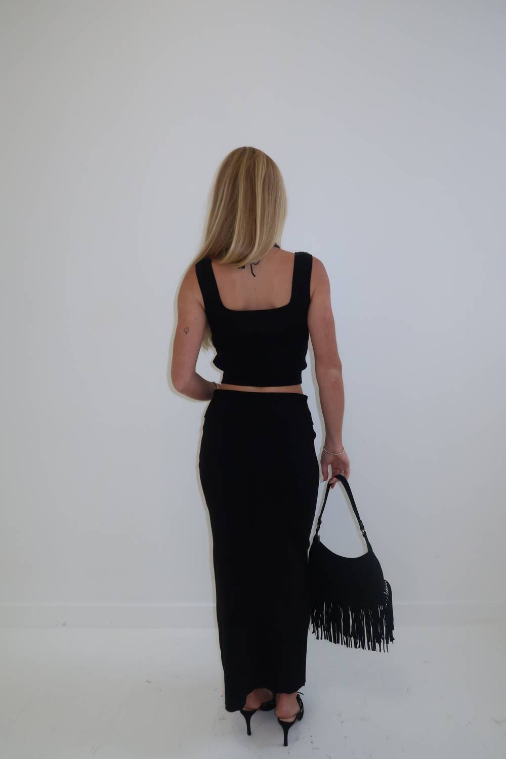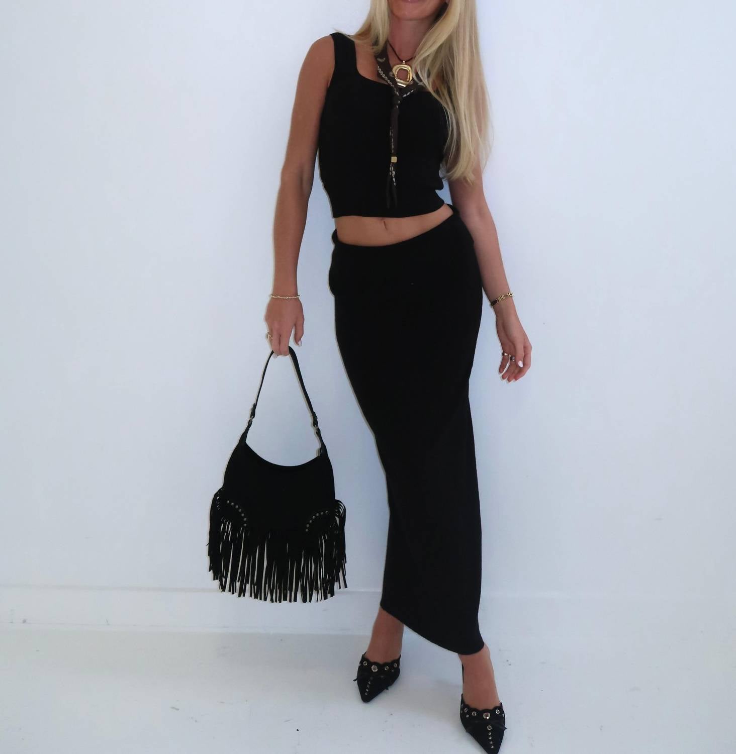 Introducing The Selene Set by Et Clet, a chic two-piece ensemble in classic black, perfect for vacation styling. This set features a tank top and a maxi skirt with a fold-over waistband detail, crafted from a stretchy, soft knit fabric offering comfort and versatility. The solid pattern and pull-on closure make it a go-to choice for effortless elegance. Care: Hand wash.