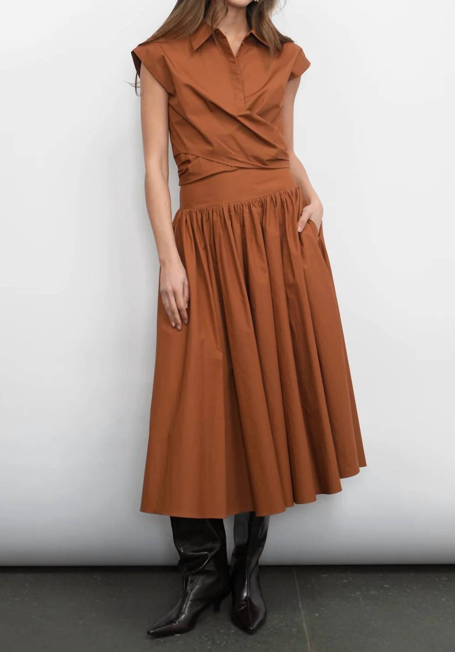 Show off just the right amount of skin in this beautifuly designed midi length skirt. Presenting the Etienne Midi Skirt by GREYLIN, a summer essential in sophisticated camel. This skirt features a midi-length with a high-rise smocked waistband enhancing a flattering silhouette, while a voluminous gathered design flows gracefully in a dynamic A-line shape. Crafted from 100% Cotton, with convenient pockets and a pull-on closure, this piece offers both elegance and comfort. Care: Hand wash and lay flat to dry. Model is wearing a size small, true to size.