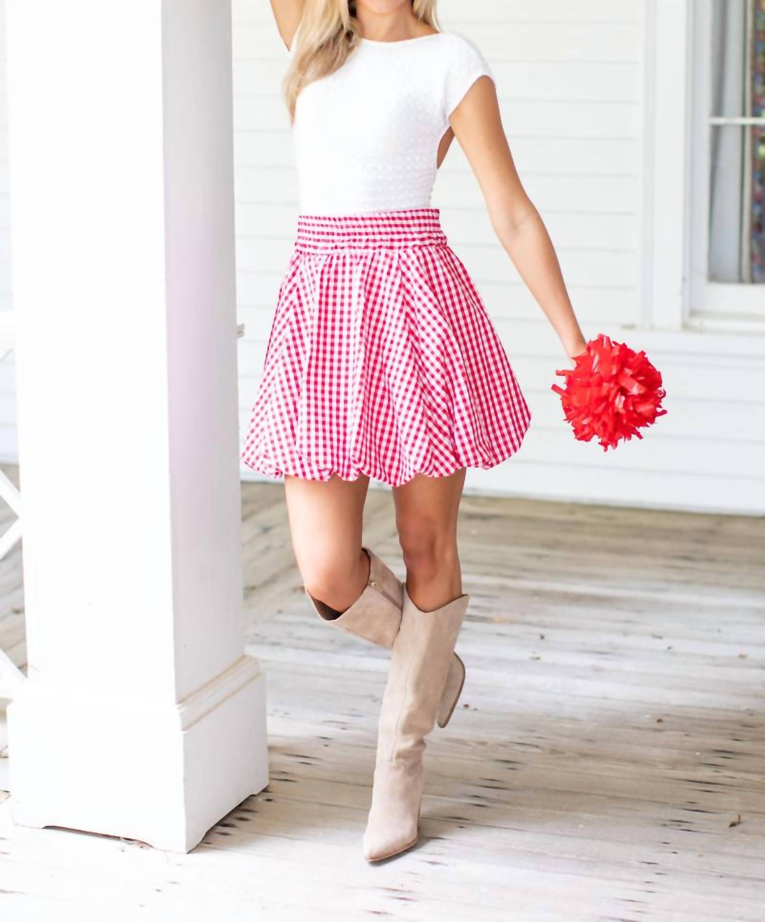 The perfect mini skirt does exist. Embrace timeless style with the Gingham Bubble Skirt by House of MBR, perfect for your spring vacations. This mini skirt, designed in a classic red gingham pattern, is crafted from a 97% cotton poplin and 3% spandex blend, ensuring comfort and a flattering fit. Proudly made in the USA, it features a convenient pull-on closure for ease of wear. Ideal for pairing with your favorite tops, this skirt channels a nod to 90s fashion.