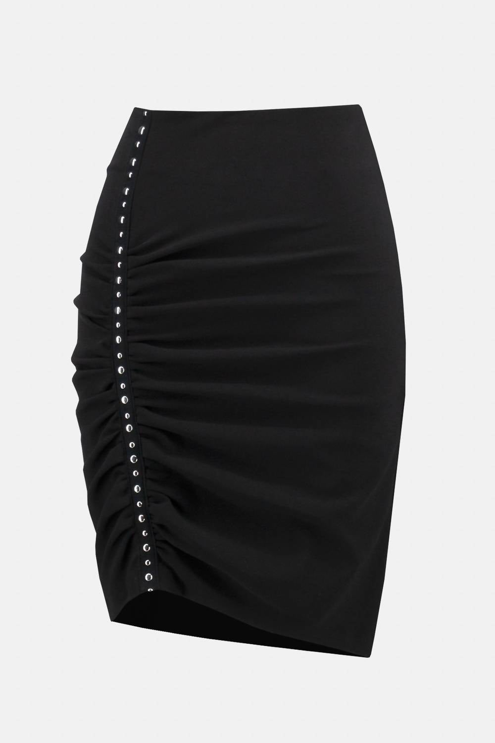 This pencil skirt is suprisingly comfortable and hugs in all the right places. Embrace elegance with the Joseph Ribkoff Embellished High-waist Pencil Skirt, a black masterpiece crafted from stretch woven twill. This mini-length skirt, measuring 21 inches, features front shirring and embellishment tape, adding a touch of luxury to your ensemble. Made in Canada, it boasts a composition of 95% Polyester and 5% Spandex, ensuring a comfortable fit, enhanced by back darts. The invisible center-back zip closure promises a seamless look, perfect for showcasing your favorite heels. Care for it with hand wash and line dry.