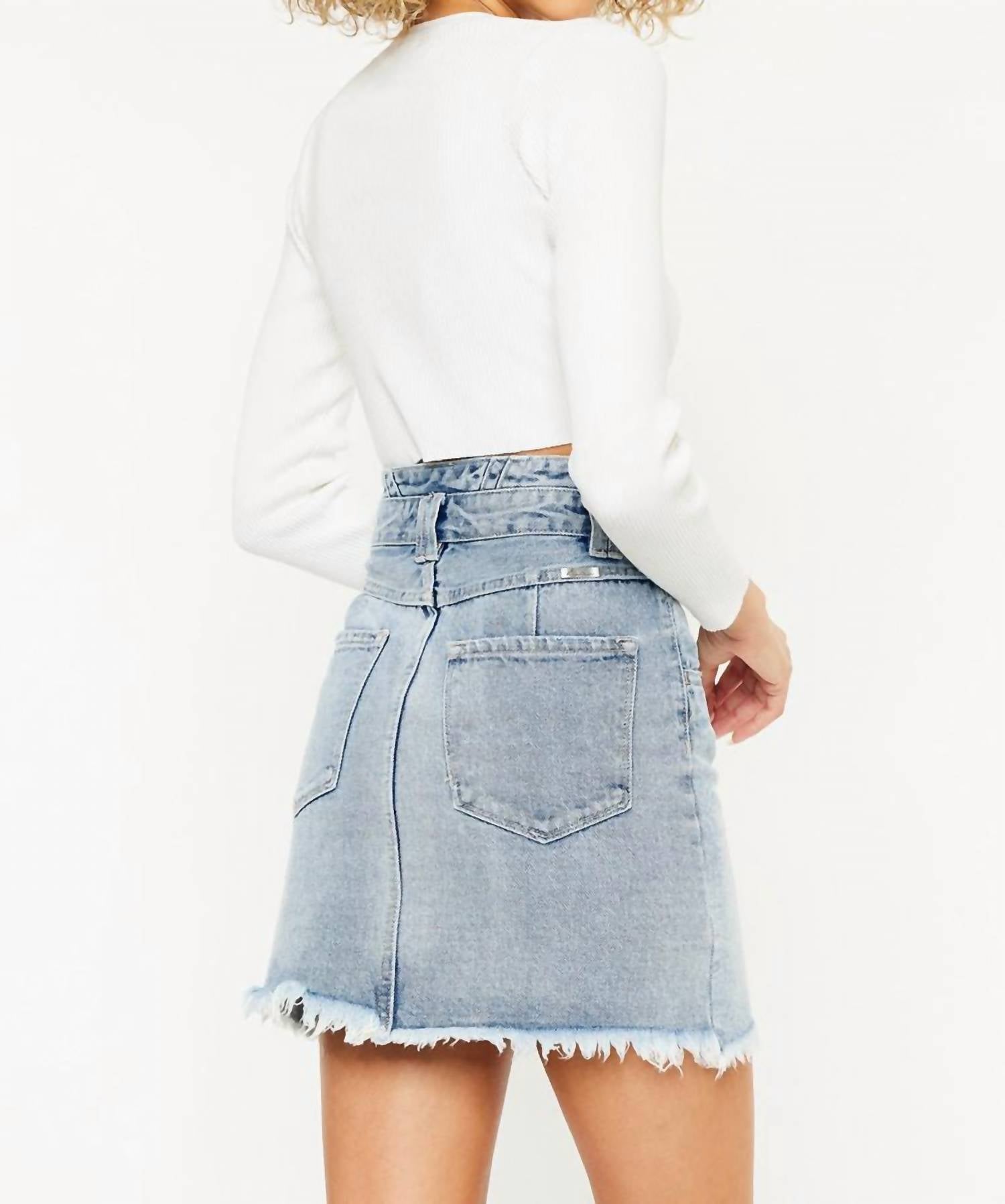 Tuck in your favorite tee for a more laid-back vibe. Elevate your summer wardrobe with the High Rise Skirt from KanCan, a stylish choice in a light wash denim crafted to perfection. This 16-inch mini skirt offers the perfect blend of playful design and comfort, made from durable 100% Cotton. Featuring functional pockets and a button closure, this skirt is the ideal minimalist piece for any holiday party. Care is straightforward with machine washable fabric, and simply line dry to maintain its shape and color.