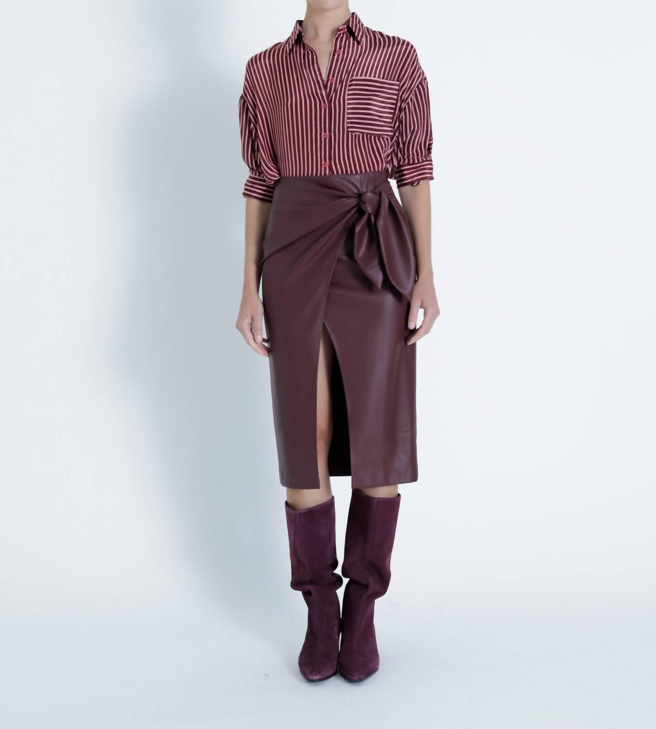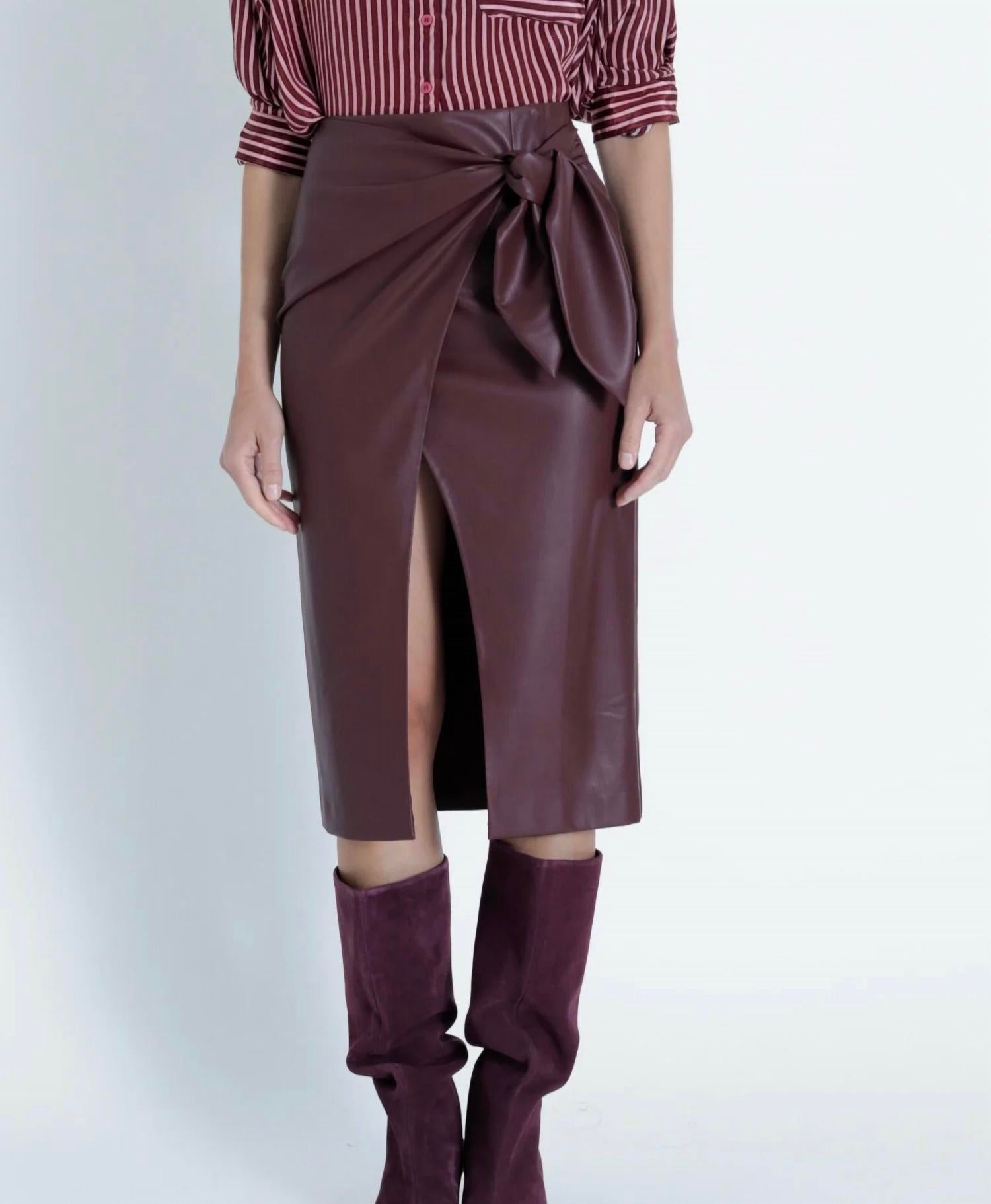 Tuck your favorite tee into this midi length skirt for an effortlessly cool look. Elevate your style with the Sybill Vegan Leather Midi Skirt by Karina Grimaldi, perfect for adding a touch of sophistication to your wardrobe. Featuring a sleek pull-on closure, this skirt in a rich Malbec hue embodies minimalist elegance with a modern edge. Its solid faux leather construction and alluring front wrap slit make it a standout piece for any spring holiday party. The tie on the side compliments a cruelty-free yet luxe appearance, ideal for any fashion-forward occasion.
