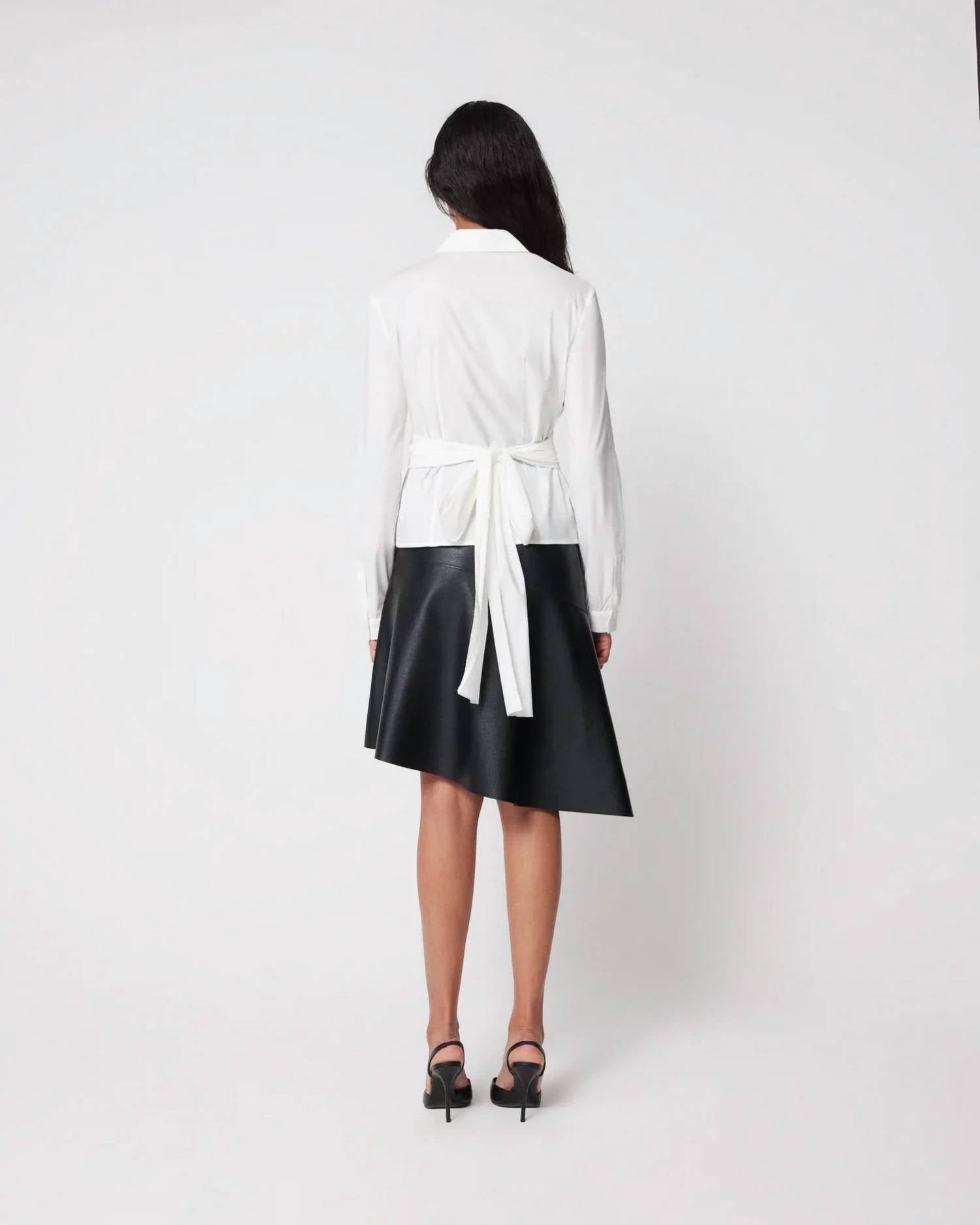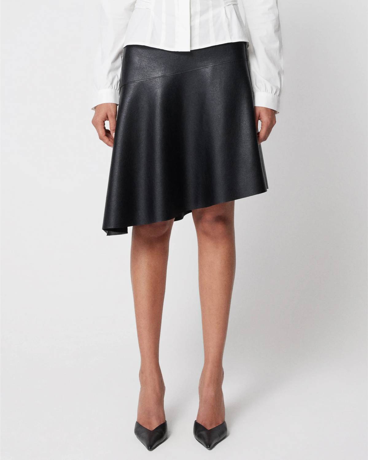 The perfect mini skirt does exist. Elevate your evening wardrobe with the Faux Leather Asymmetrical Skirt by KHY, designed in a sleek black hue. Crafted from buttery-soft premium faux leather, this mini skirt features a low-rise fit and an 18.5-inch length, perfect for side-sitting on the high hip. It boasts a striking asymmetrical hem with a flared skirt tier and side zipper closure, adding a contemporary edge to your look. Composition: 100% Polyurethane, ideal for fall events and workwear trends.