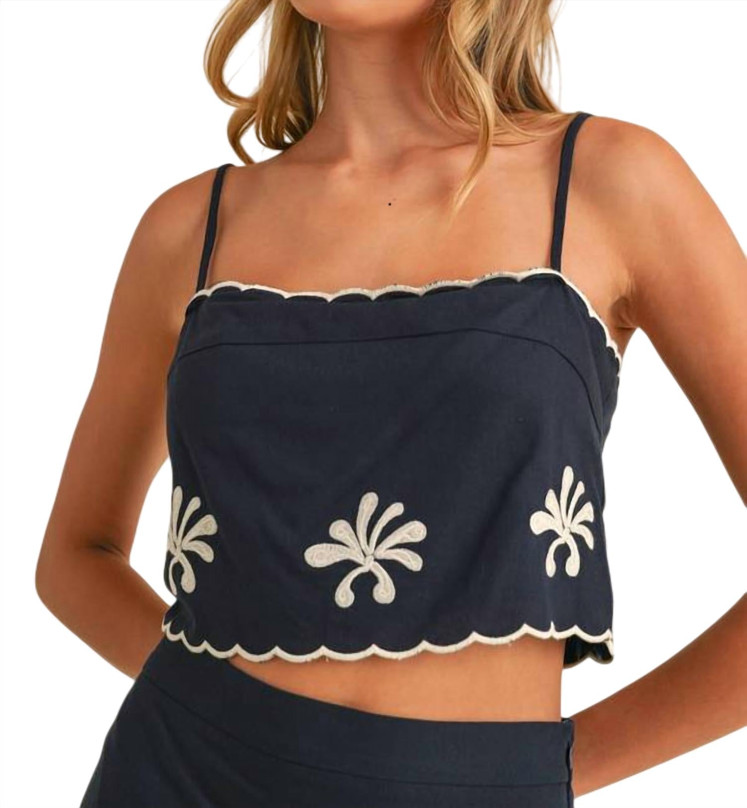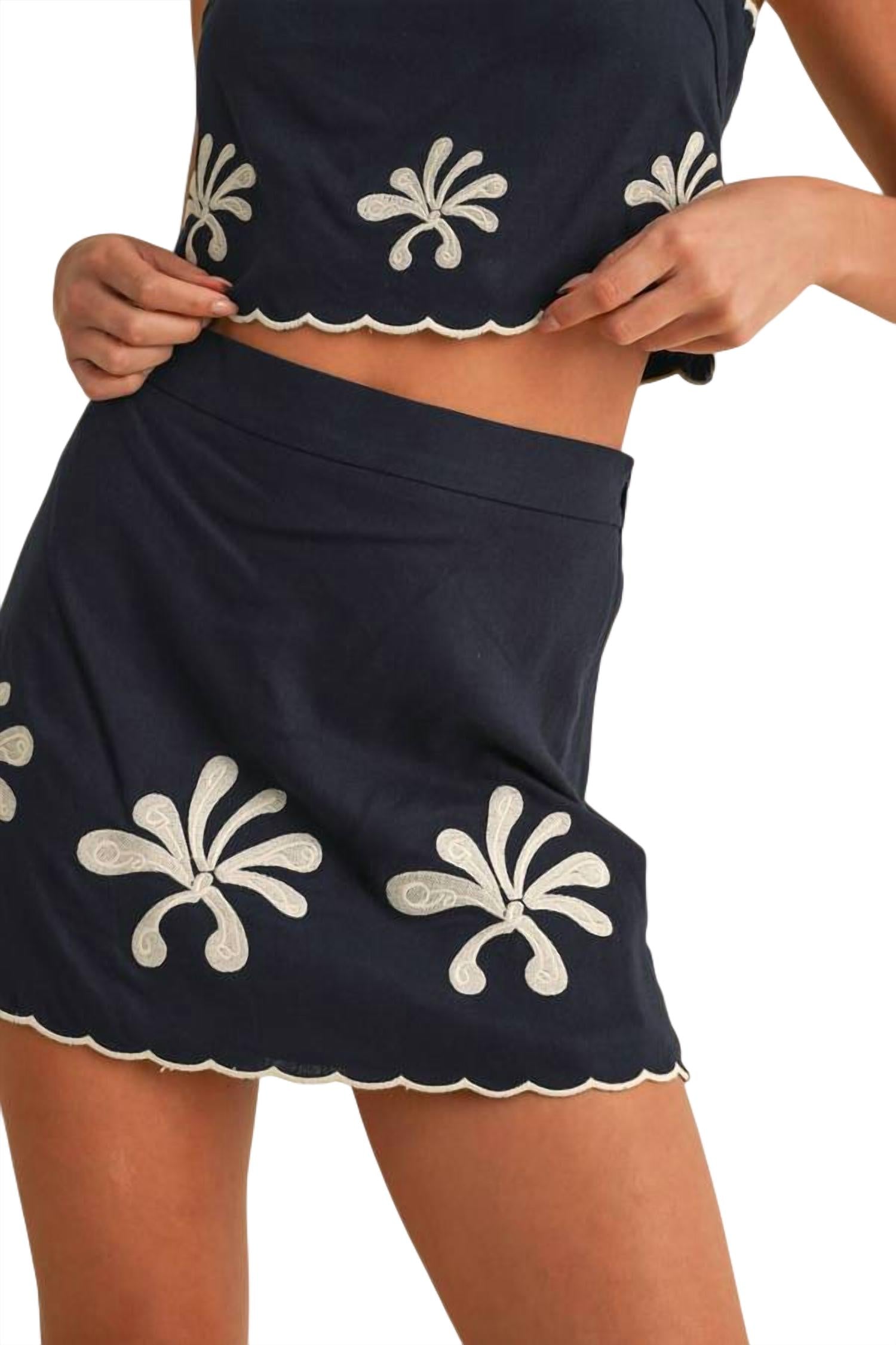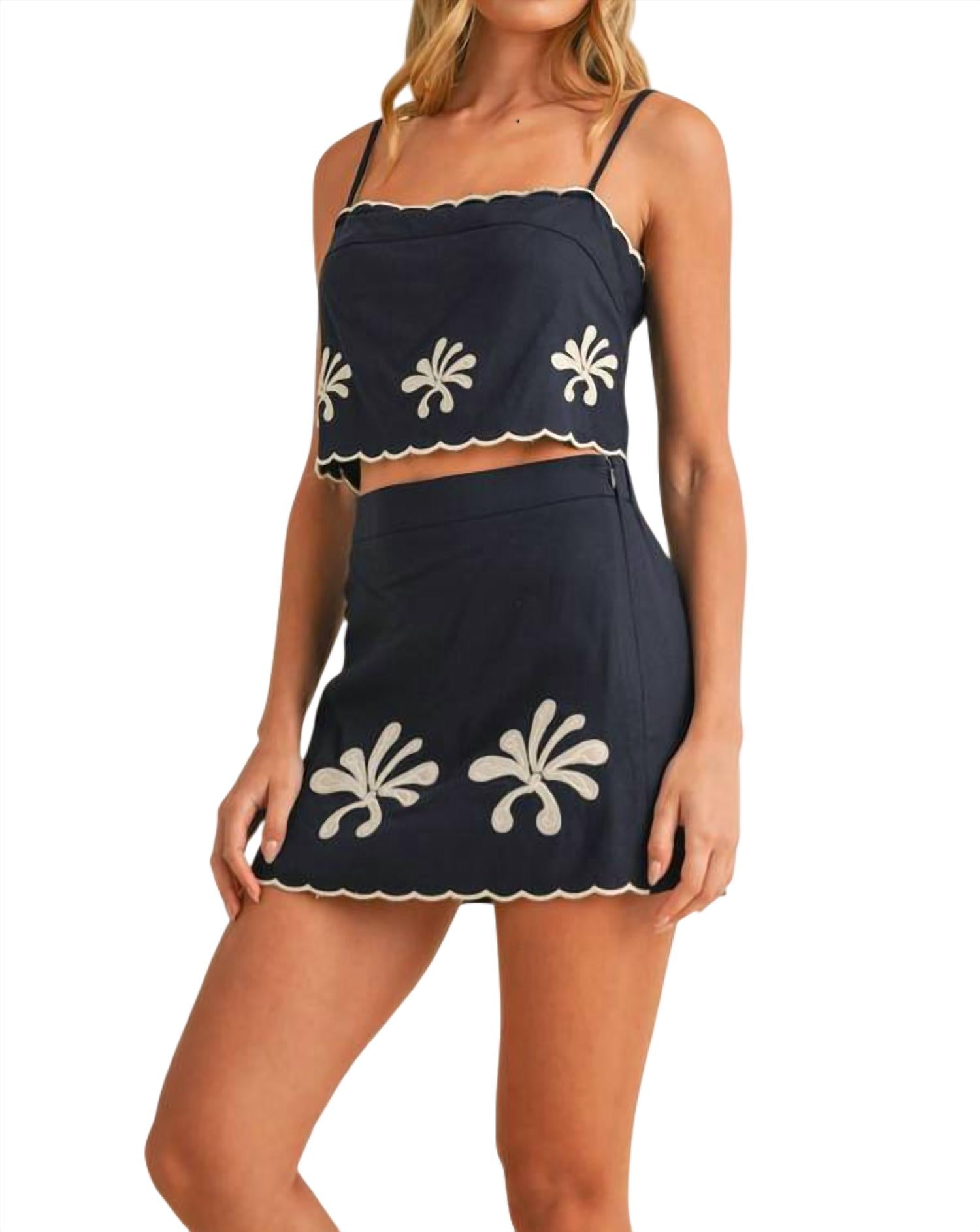 Introducing the Rowe Linen Skirt Set by Klesis, perfect for your summer wardrobe in a chic navy floral print. This women's set includes a linen blend cami top with adjustable spaghetti straps and an eyelet trim, paired with a high-waisted mini skirt featuring a smocked waistband for added comfort. Closure: Zip closure. Care: Machine wash and line dry. The model stands at 5'7" with a 34" bust and 26" waist, wearing a size small.