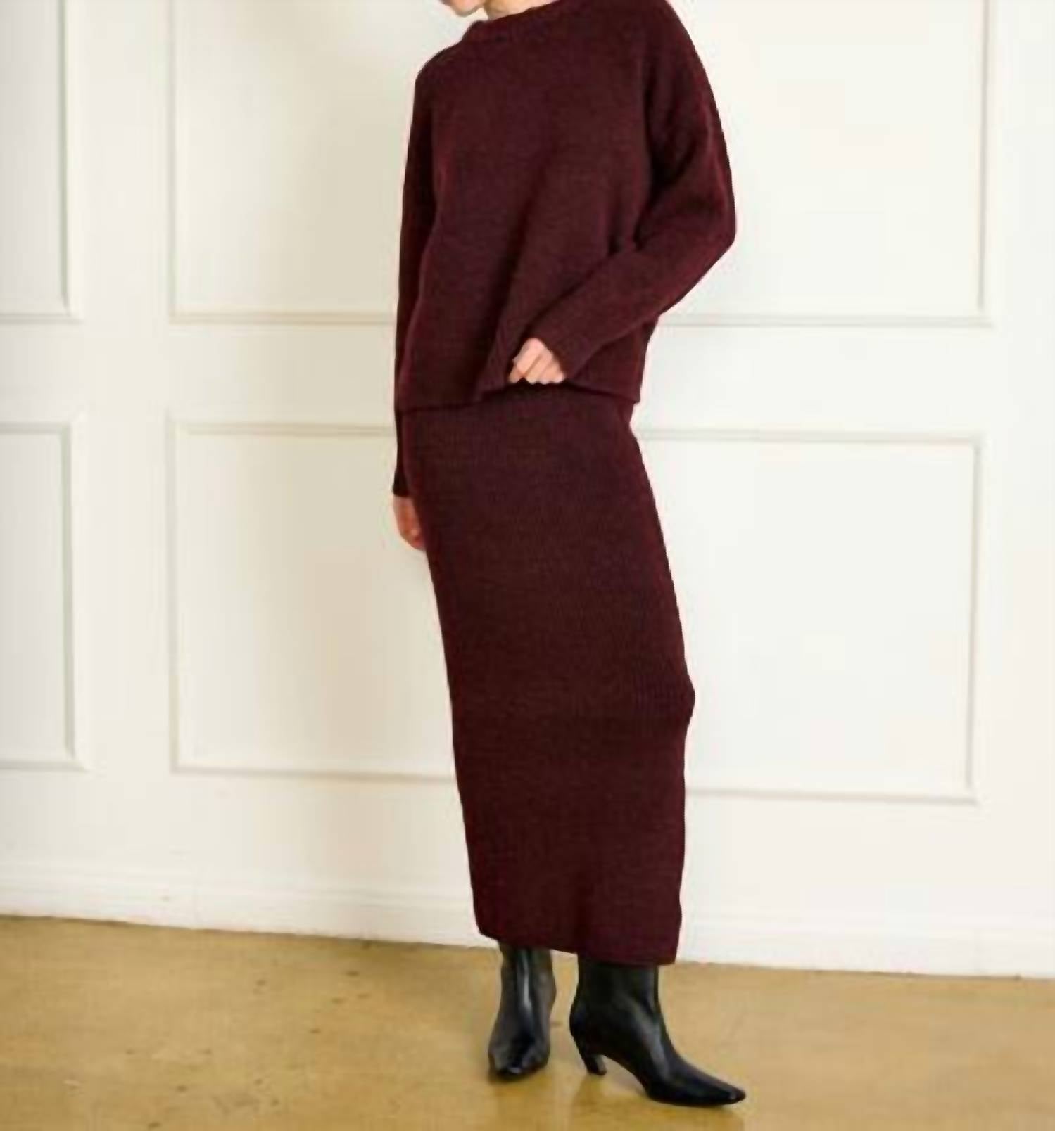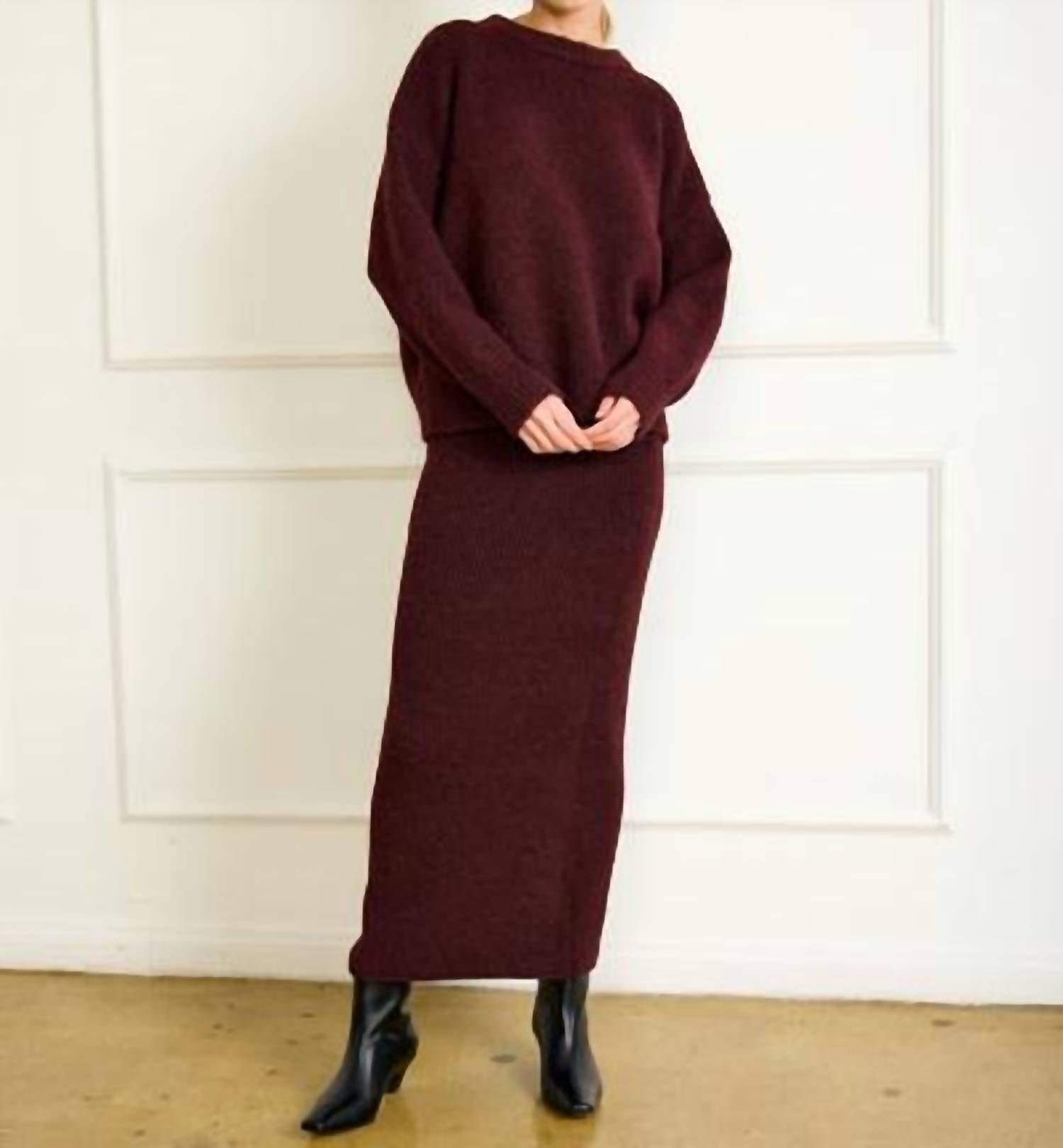 Tuck your favorite tee into this midi length skirt for an effortlessly cool look. The Hart Sweaters Skirt by Line and Dot is a chic addition to your fall wardrobe in a rich burgundy hue. This textured midi skirt offers a flattering silhouette with a convenient pull-on closure. Crafted with a trendy monochrome design, it's ideal for Thanksgiving celebrations or vacation outings. It pairs beautifully with a variety of tops, offering versatile styling for any occasion.