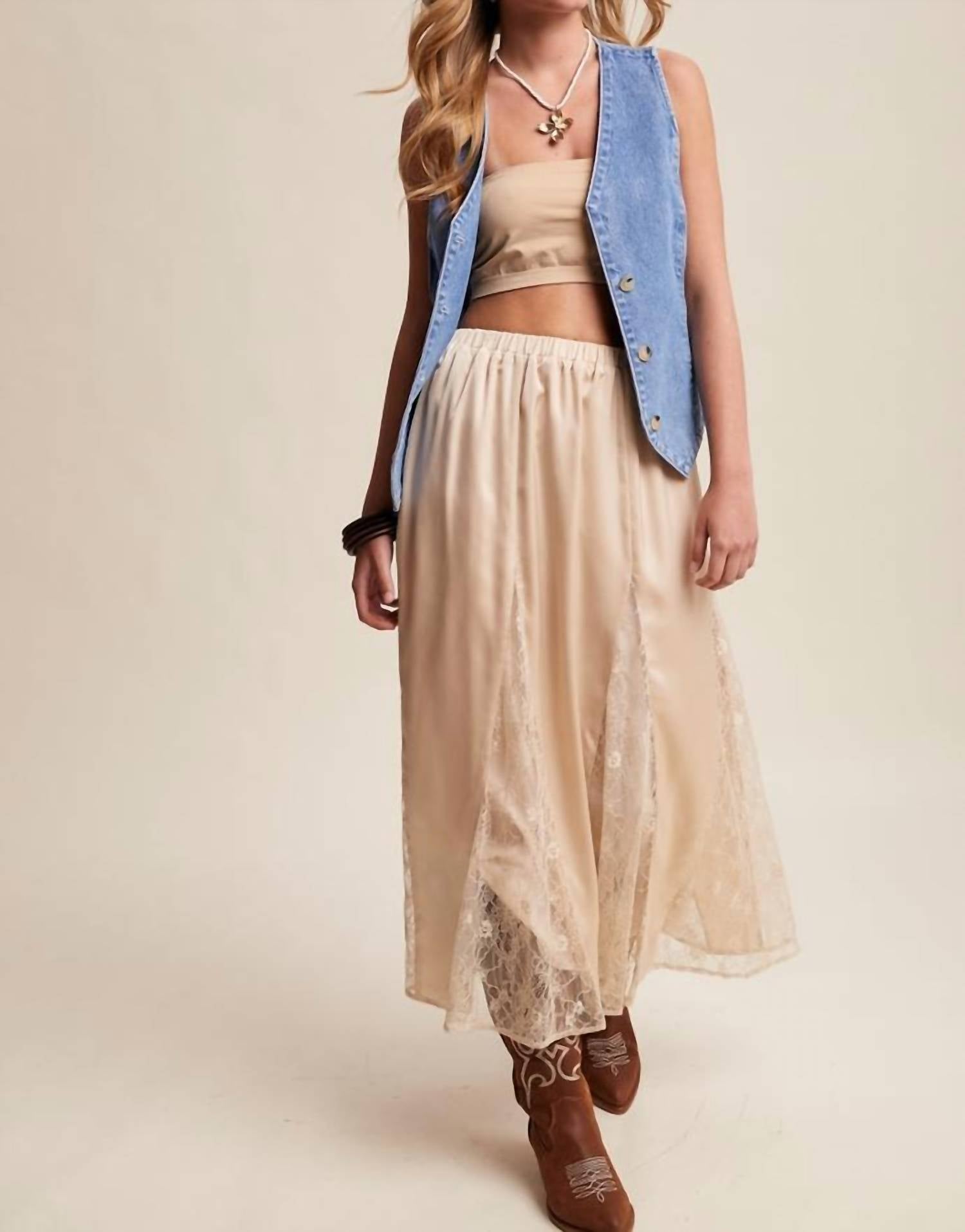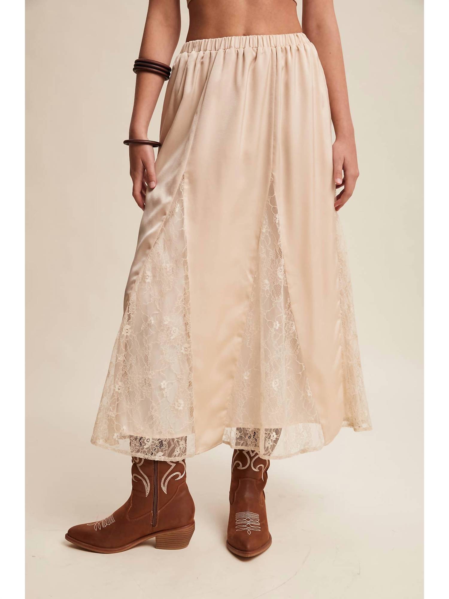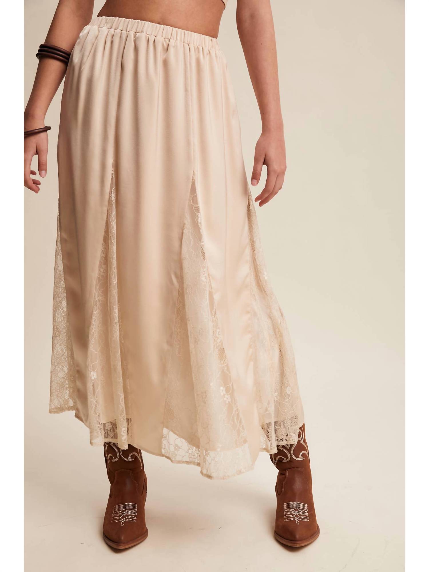 The midi length skirt is here to stay and we especially love this style. Elevate your wardrobe with the Lace Inset Midi Skirt by Listicle, a perfect blend of sweet elegance and versatility in a creamy hue. This pull-on skirt features a flattering full shape with beautiful lace insets on the sides, ideal for a flirty, feminine look. Made from 100% polyester, it's fully lined to ensure smooth wear and comfortable movement. Easy to care for, simply machine wash and tumble dry to keep it looking fresh.