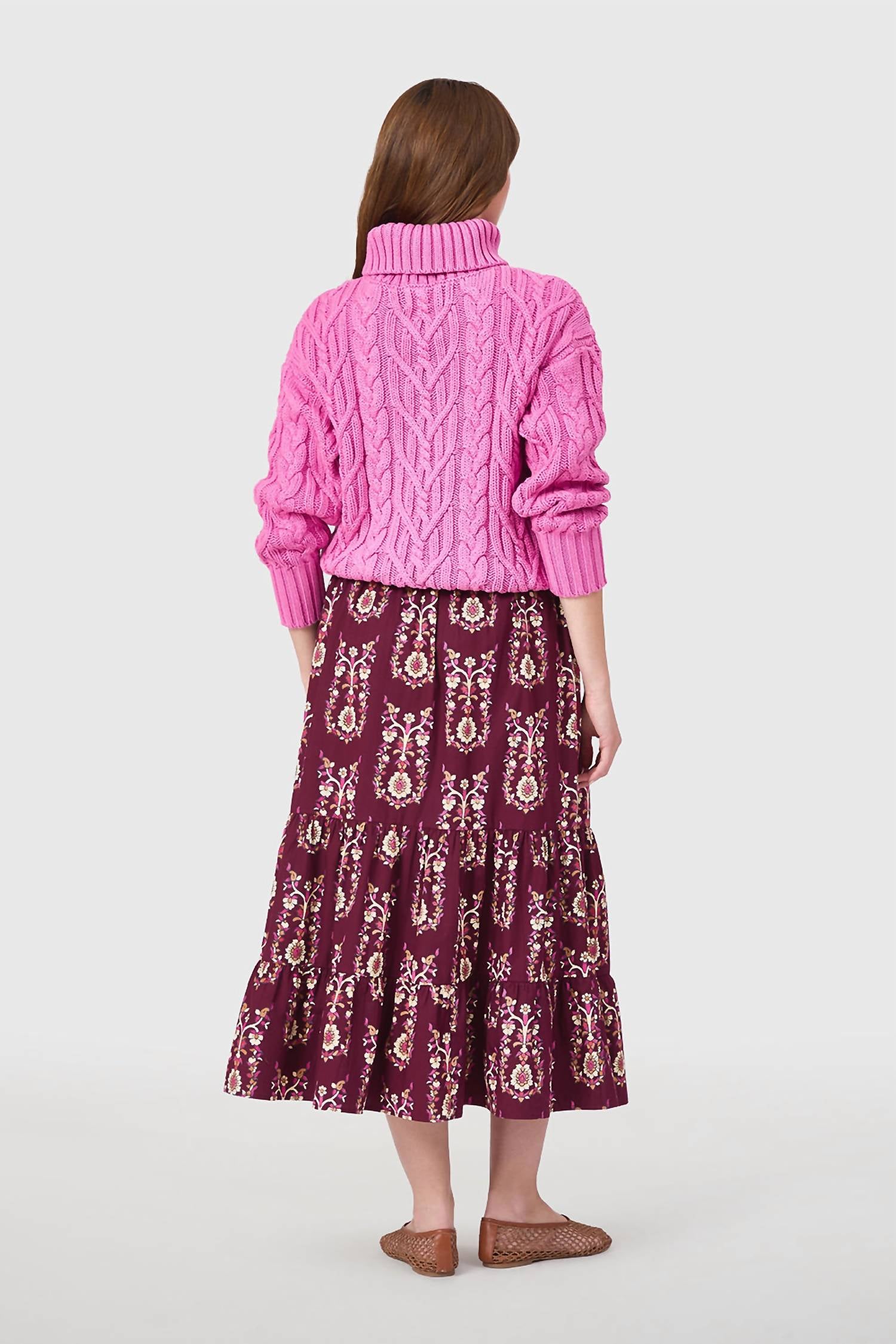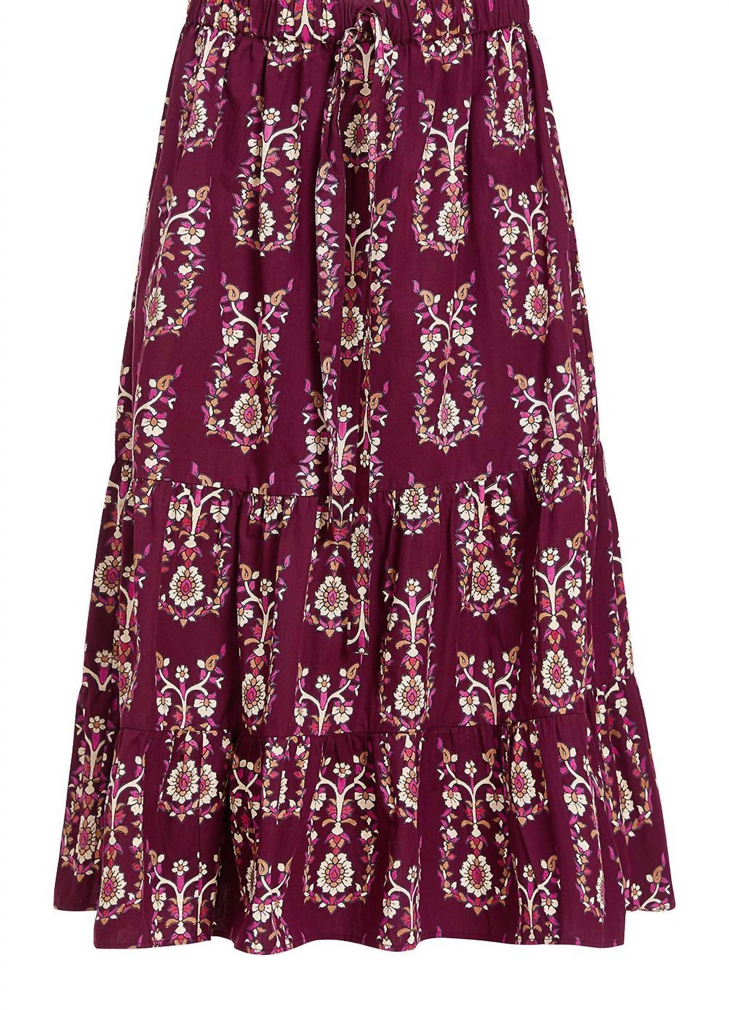 Tuck in your favorite tee for a more casual yet feminine look. Embrace boho chic style with the Market Bramble Motifs Maxi Skirt from Livro, perfect for your spring music festival wardrobe. This burgundy, patterned skirt features a tiered body and convenient pockets, ensuring both style and functionality. Made in Jaipur, India, it offers an adjustable drawstring waist with a pull-on closure for a custom fit. Easy to care for, simply machine wash to maintain its vibrant look.