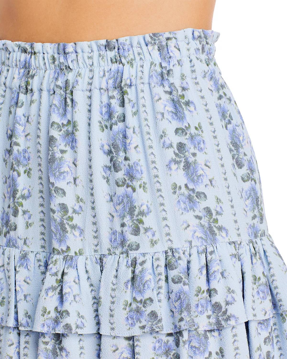 The perfect mini skirt does exist. Embrace the playful charm of the LoveShackFancy Ruffled Tiered Mini Skirt in Blue Floral, perfect for your summer vacation wardrobe. This women's mini silhouette features a pull-on style with an elasticized waistband for ease and comfort. Crafted from 100% Viscose, its allover floral pattern and tiered design capture the essence of 90s fashion. Care for this piece by dry cleaning only, ensuring its delicate structure remains intact.
