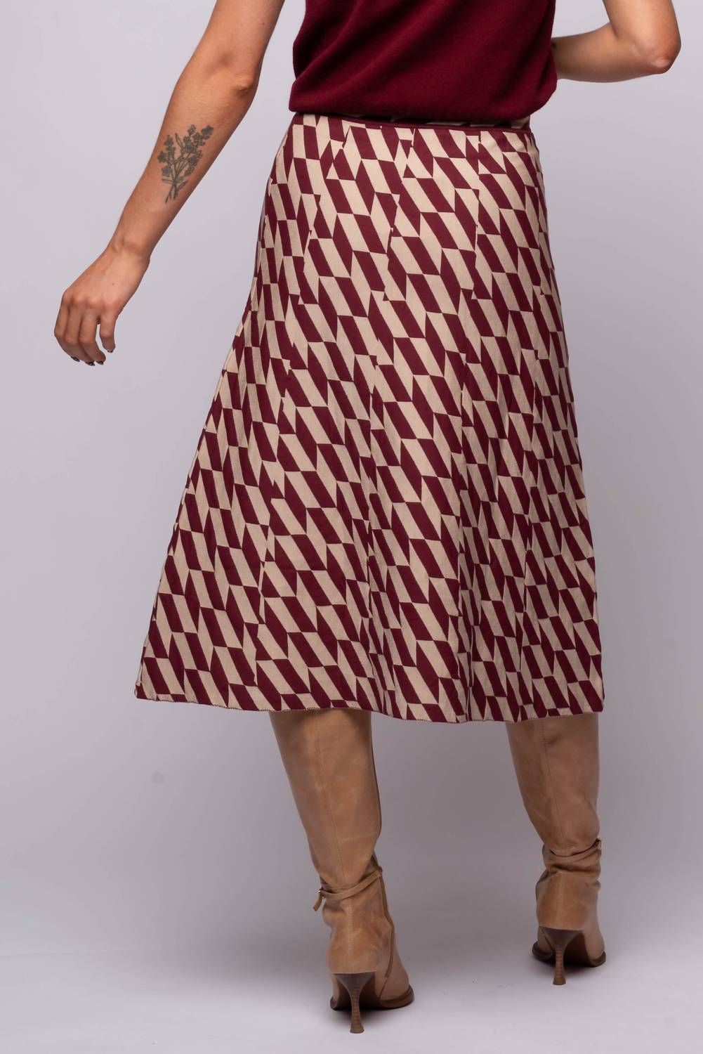 Tuck your favorite tee into this midi length skirt for an effortlessly cool look. The LUCY PARIS Katalina Knit Skirt in Burgundy Cream is a must-have for any wardrobe, offering an elegant geometric pattern perfect for fall dinner parties. With a flattering A-line silhouette, this midi skirt accentuates the waist and drapes smoothly over the hips. It's crafted from a soft blend of 43% Rayon, 29% Polyester, 25% Nylon, and 3% Spandex, ensuring comfort and movement. Closure: Pull-on style. Care: Turn inside out and hand wash cold, then lay flat to dry. Taylor, who is 5'3" with a 32" bust, 24" waist, and 33" hips, models the skirt in size X-small, staying true to size. Imported.