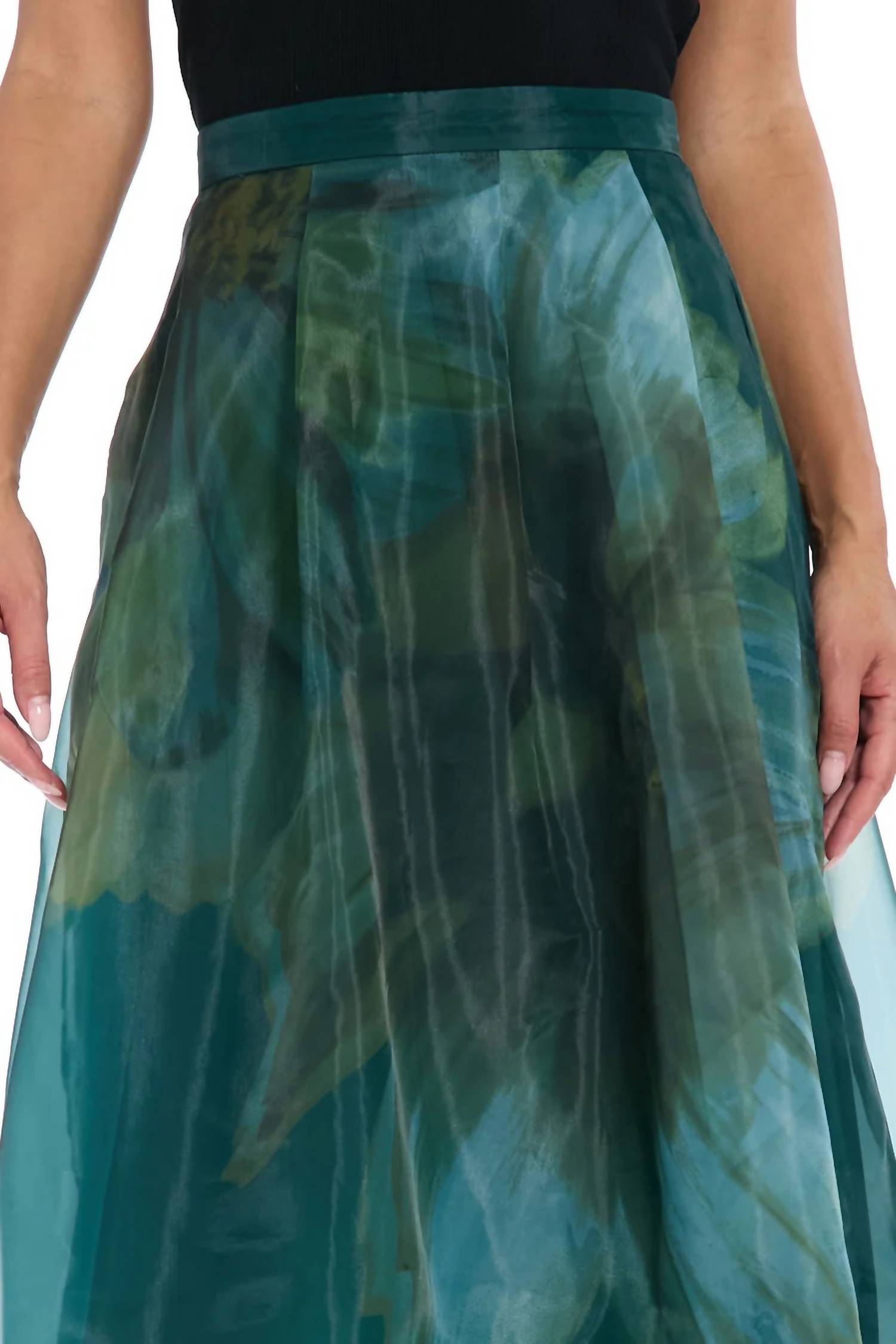 Tuck your favorite tee into this midi length skirt for an effortlessly cool look. Introducing the Organza Midi Skirt by Maggy London, a stylish piece in a captivating teal and blue patterned blend. Made of 100% Polyester, this skirt elegantly combines a lightweight, sheer fabric with a graceful flow, perfect for both evening events and stylish everyday wear. Originating with a secure zip closure, this skirt effortlessly complements various tops and accessories. For best care results, turn inside out and machine wash cold, then reshape and lay flat to dry, with a warm iron as needed.