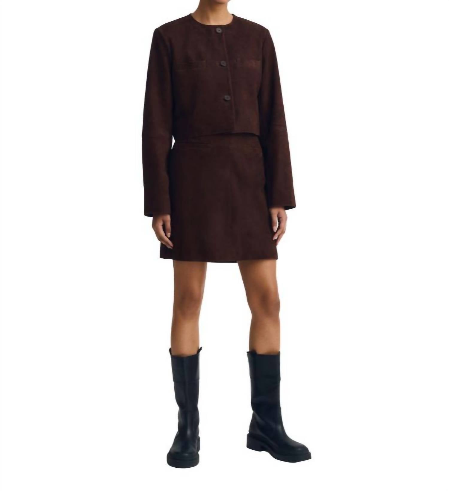 The perfect mini skirt does exist. Elevate your fall wardrobe with the Morissa Suede Skirt by MELISSA NEPTON, a chic mini skirt crafted from 100% suede. This solid brown piece is designed for stylish versatility, perfect for engagement parties or celebrating Thanksgiving. The skirt features a sleek silhouette with no pockets and offers machine washability for easy care. Enjoy the retro Y2K vibe with a timeless elegance that complements any occasion.