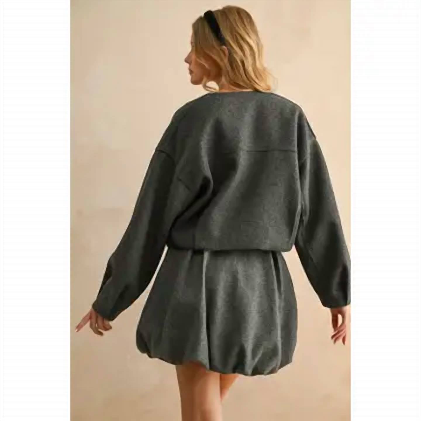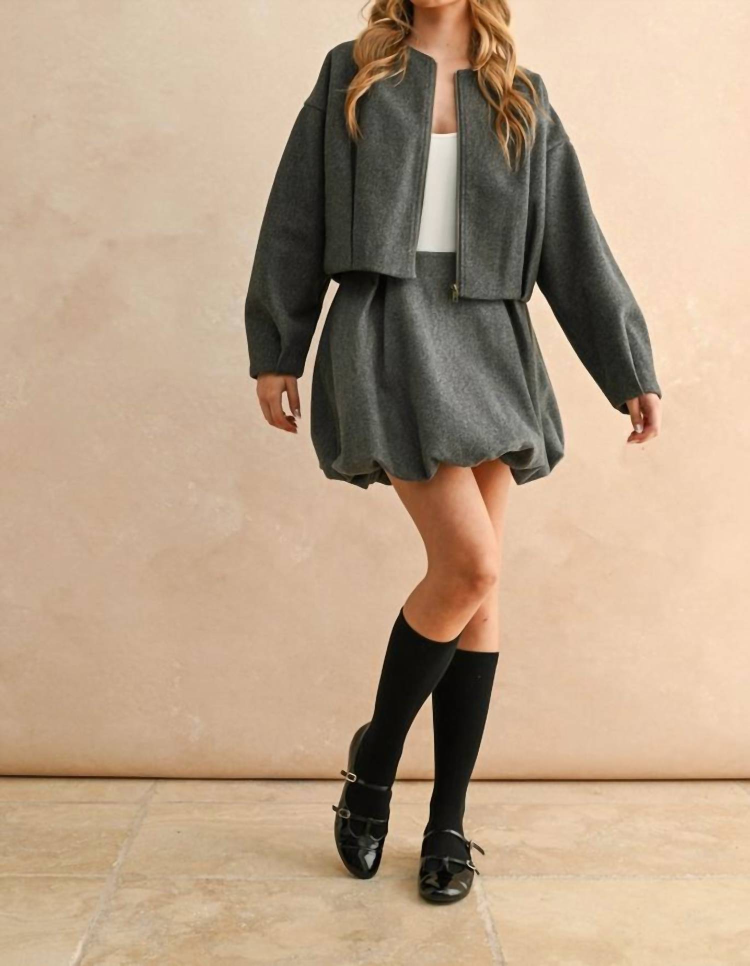 Tuck in your favorite tee for a more laid-back vibe. The Nina Pleated Detail Balloon Mini Skirt by MIOU MUSE offers a minimalist yet sophisticated style in an elegant gray hue. This chic, pull-on skirt is meticulously crafted from 100% polyester, featuring a textured, voluminous balloon silhouette for graceful movement. Designed in a solid pattern, it is ideal for both holiday parties and Thanksgiving gatherings. Care for this imported piece with a simple hand wash and line dry. Model is wearing a size small.