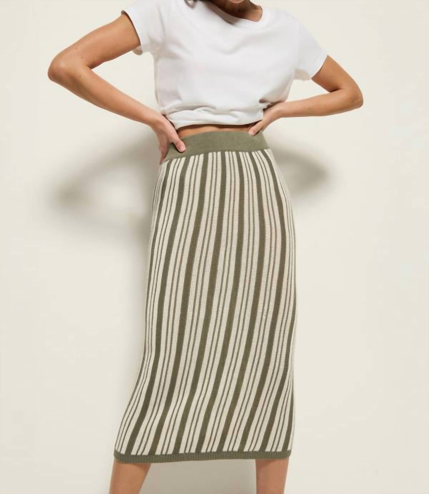 Discover the Mirella Sweater Skirt by Nation LTD, a blend of refinement and comfort in the Herb Stripe pattern. This Boho Chic midi skirt features a fitted silhouette with an elastic waistband, crafted from soft Pima Cotton knit for seamless movement. Closure: Pull on. Care: Dry clean only, made with attention to style and ease for ideal spring occasions.